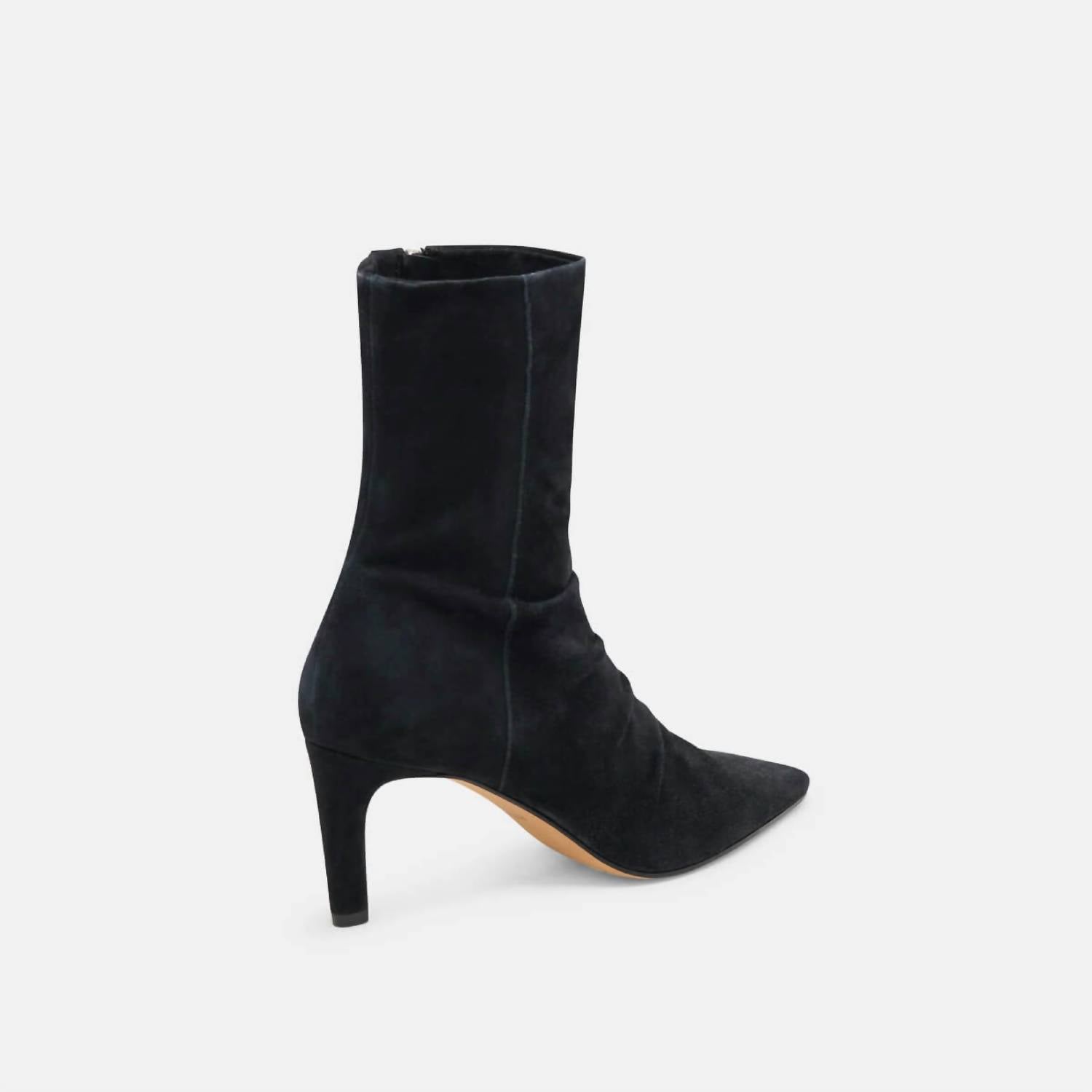 Estas botas de cano médio apresentam um elegante salto agulha com tecido drapeado e levemente pregueado para um visual despojado. Confeccionadas com um luxuoso cabedal de camurça, elas ostentam um salto de 7,1 cm e bico fino, perfeitos para elevar qualquer visual. Com cano de 20,5 cm, circunferência da perna de 27,5 cm e feitas de materiais sustentáveis, incluindo solado sintético reciclado e forro em microsuede e couro, elas oferecem estilo e apelo ecológico. Origem: Importado.