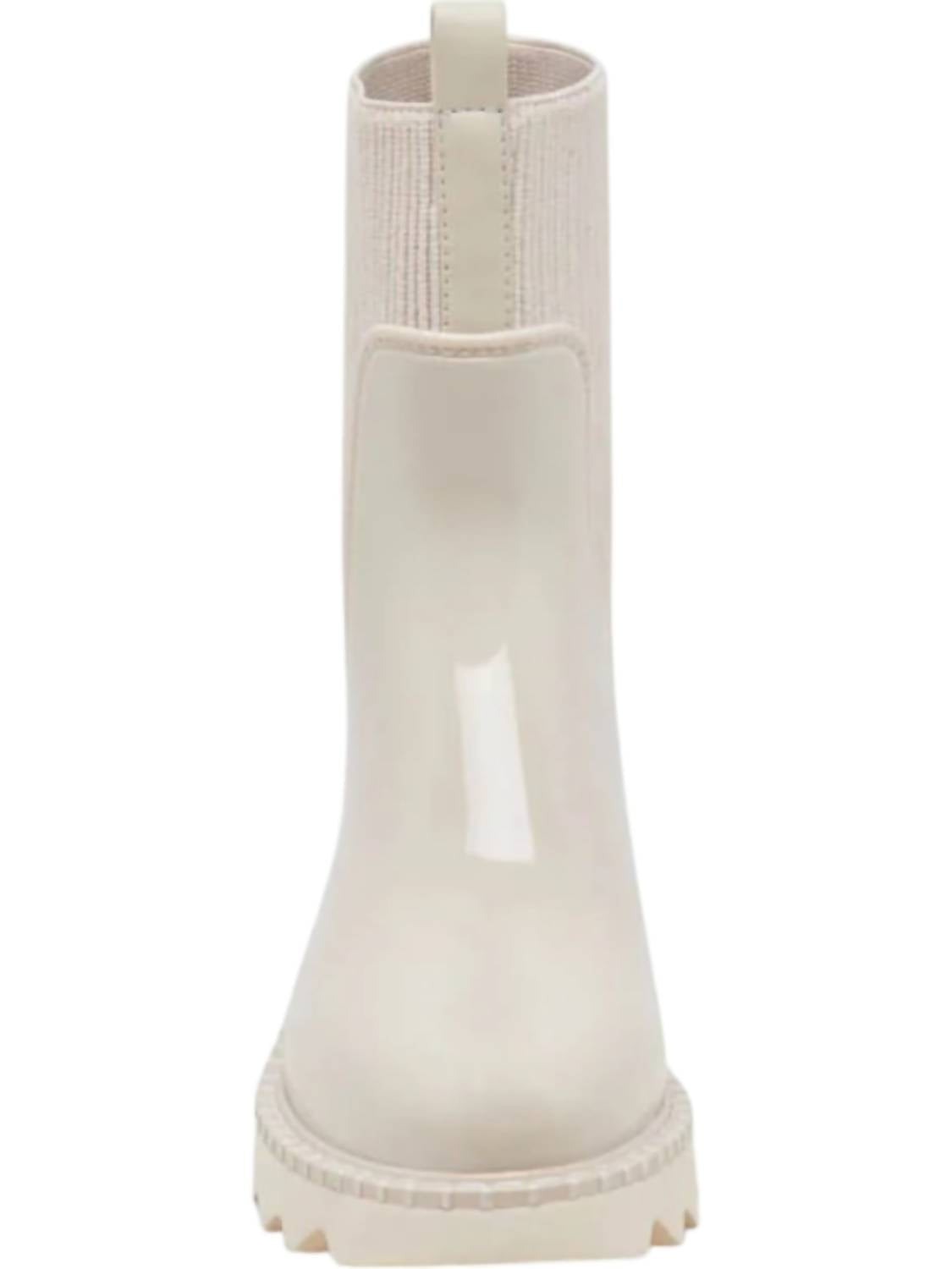 Design em couro envernizado à prova d'água. Cabedal em borracha durável e elástico. Sola robusta e ondulada para tração. Meia ecológica em couro alternativo à base de água. Cano canelado em malha para um estilo moderno. Cano de 19 cm de altura e salto de 4,5 cm. Fusão perfeita de estilo e funcionalidade. Versátil para dias chuvosos ou para o dia a dia.