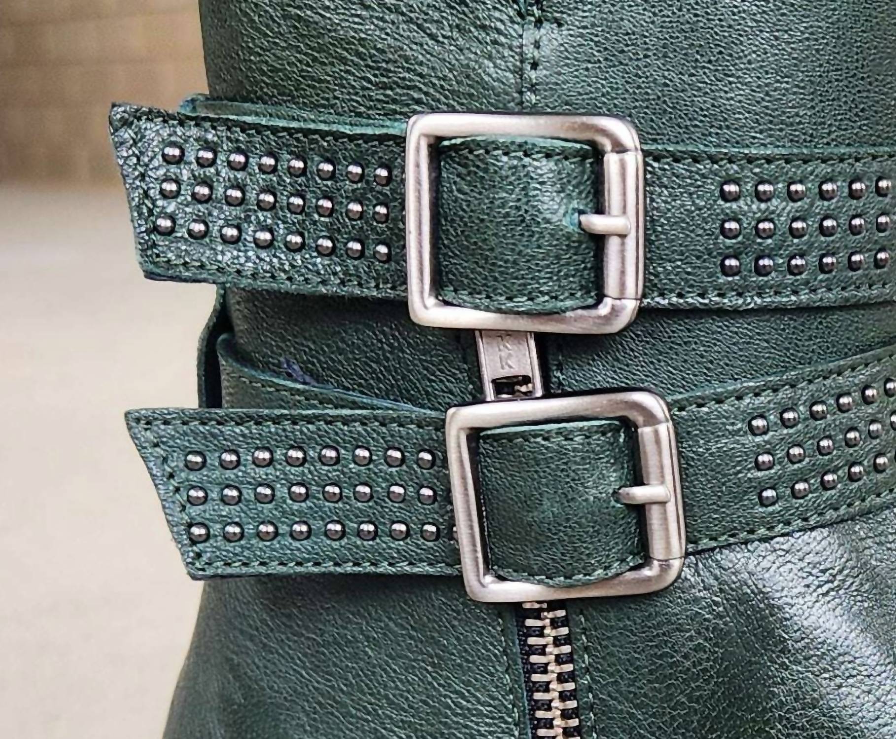 A stylish boot with a comfortable fit and the perfect amount of height. These classic boots are the perfect addition to any outfit and can be worn season after season. Step into style with the Women's Mariska Mid Calf Boot by Eric Michael, a chic addition to your wardrobe in green faux leather. These boots feature a mid-calf length and a convenient inside zipper closure, complemented by double studded buckles and a 2.5" block heel for a touch of 90s flair. Perfect for summer travels, Thanksgiving gatherings, or any occasion where you want to make a statement. Embrace a medium width fit and a round toe shape for comfort and trendsetting elegance.