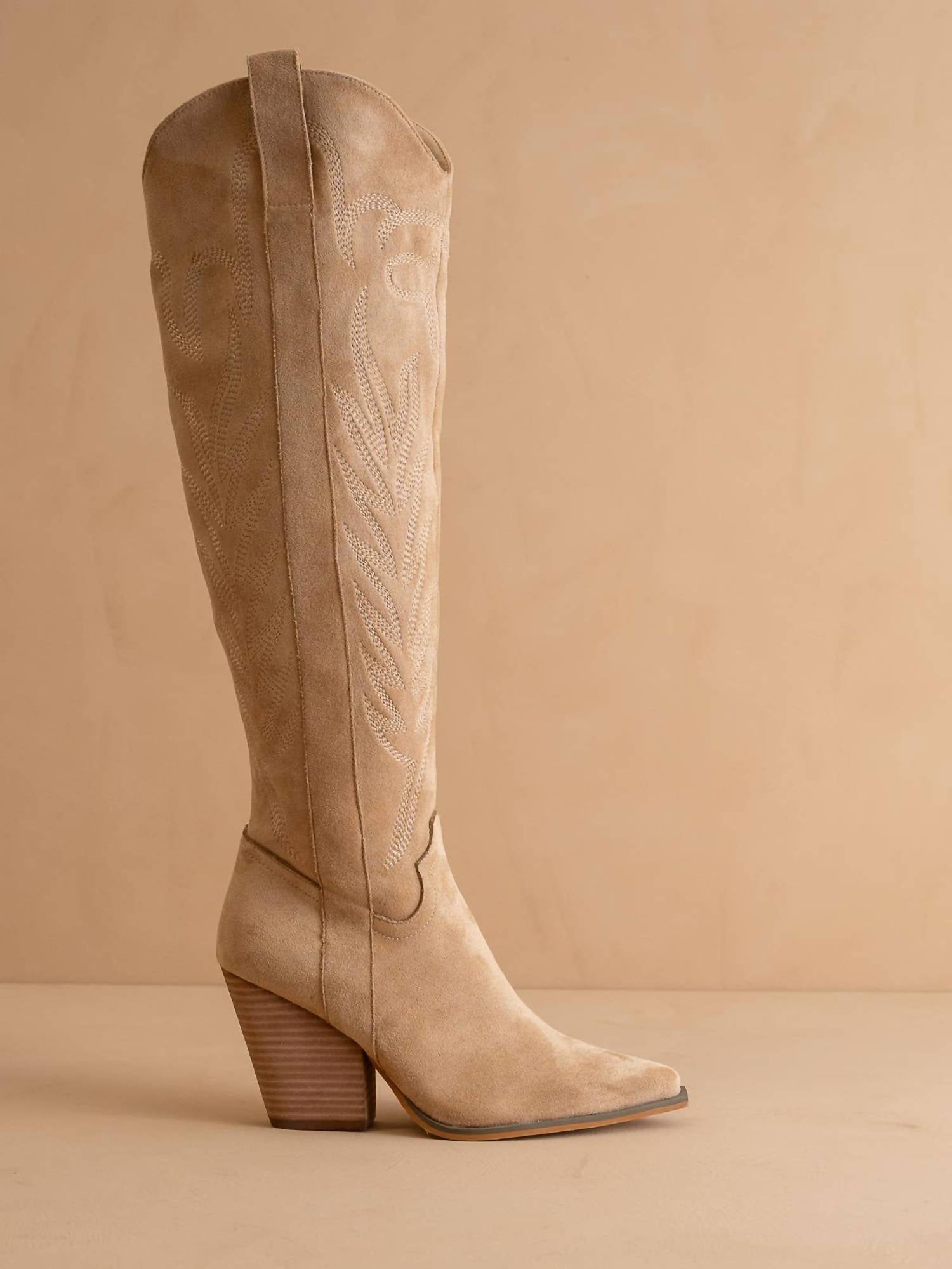 These stylish over the knee boots will look great with denim, dresses or skirts. You can't go wrong! Step into style with the Women's Bronco Knee High Western Boots from OASIS SOCIETY. These almond-colored boots feature classic cowboy embroidery on a suede upper, accompanied by a comfortable padded insole and an elegant leather wrap block heel. With a shaft height of 18 inches and a heel height of 3.5 inches, the boots boast a pointed toe and a 14.75-inch shoe opening circumference. Perfect for a Thanksgiving holiday party, the boots are secured with a zipper closure, reflecting their trend-setting Western appeal.