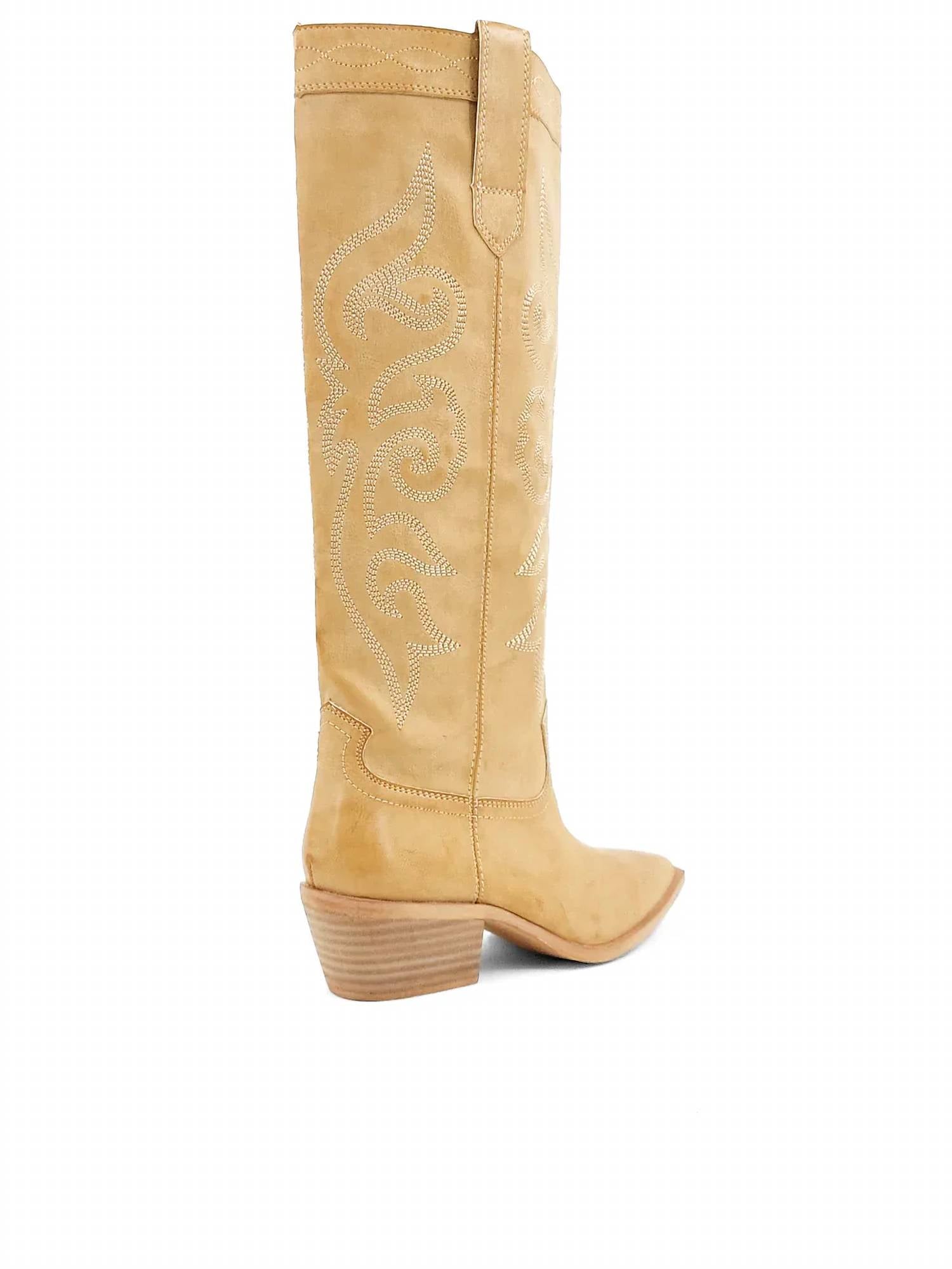 Upgrade your shoe game with these classic heeled boots, designed to merge sophistication and style. Comfortable enough for long days or a night out on the town. Step into style with the Women's Zaire Boot by SHU SHOP, crafted for those who appreciate a modern twist on the classic cowgirl aesthetic. These natural-colored, pointed-toe, knee-high boots are a stunning choice for the fall season. Featuring a trendy block heel, they are perfect for elevating minimalist outfits, making them ideal for a concert occasion. Wear these eye-catching western-inspired beauties to stride confidently into any event.