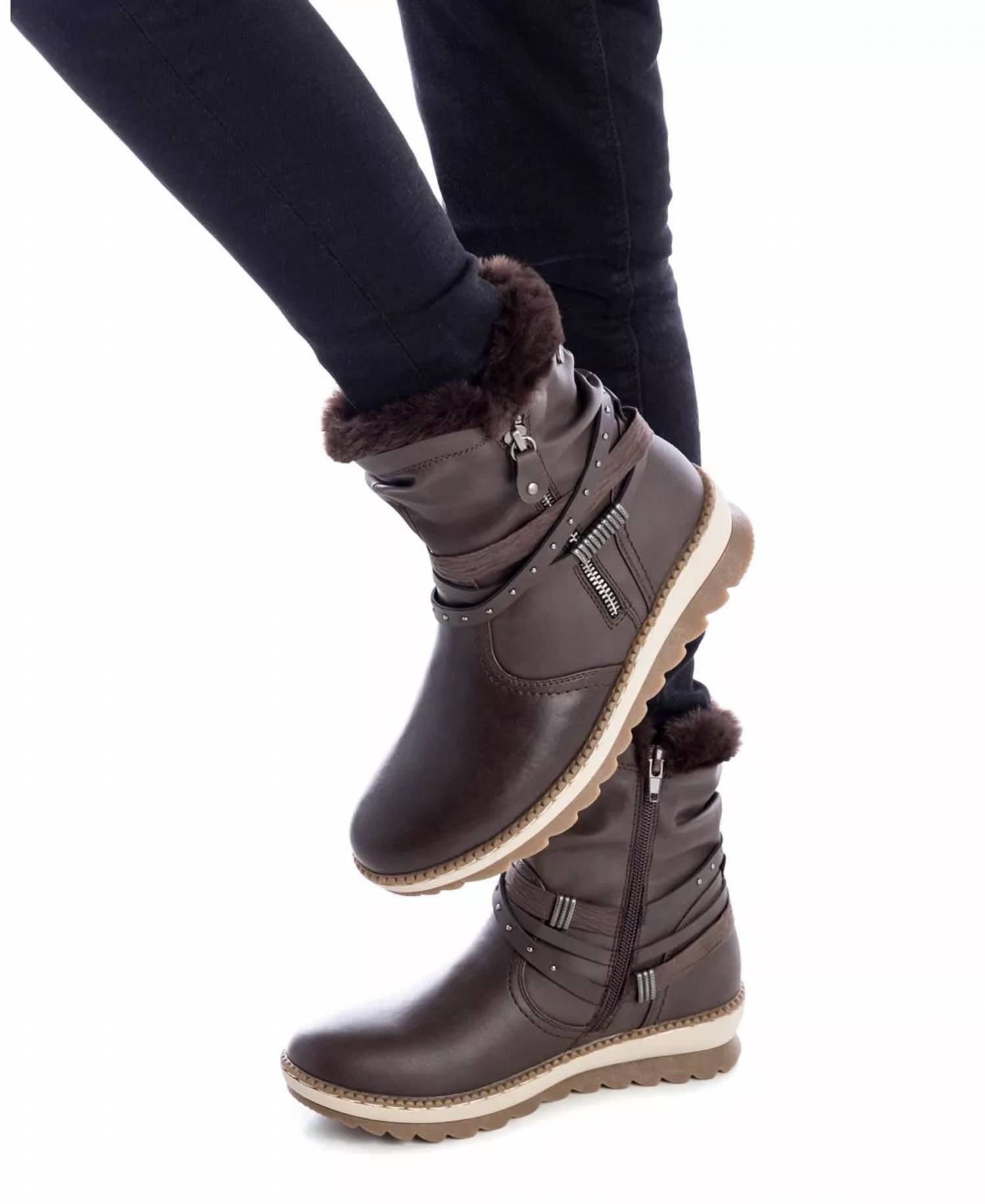 Rainboots so cute, you'll want to wear these even on the lightest drizzle days. This Women's Winter Bootie features decorative straps, an outer side zipper, plush fur lining, and a practical side zipper closure. With a lightweight non-slip rubber sole, 1.57-inch heel, and round toe design, these booties combine style, warmth, and comfort for the colder months.