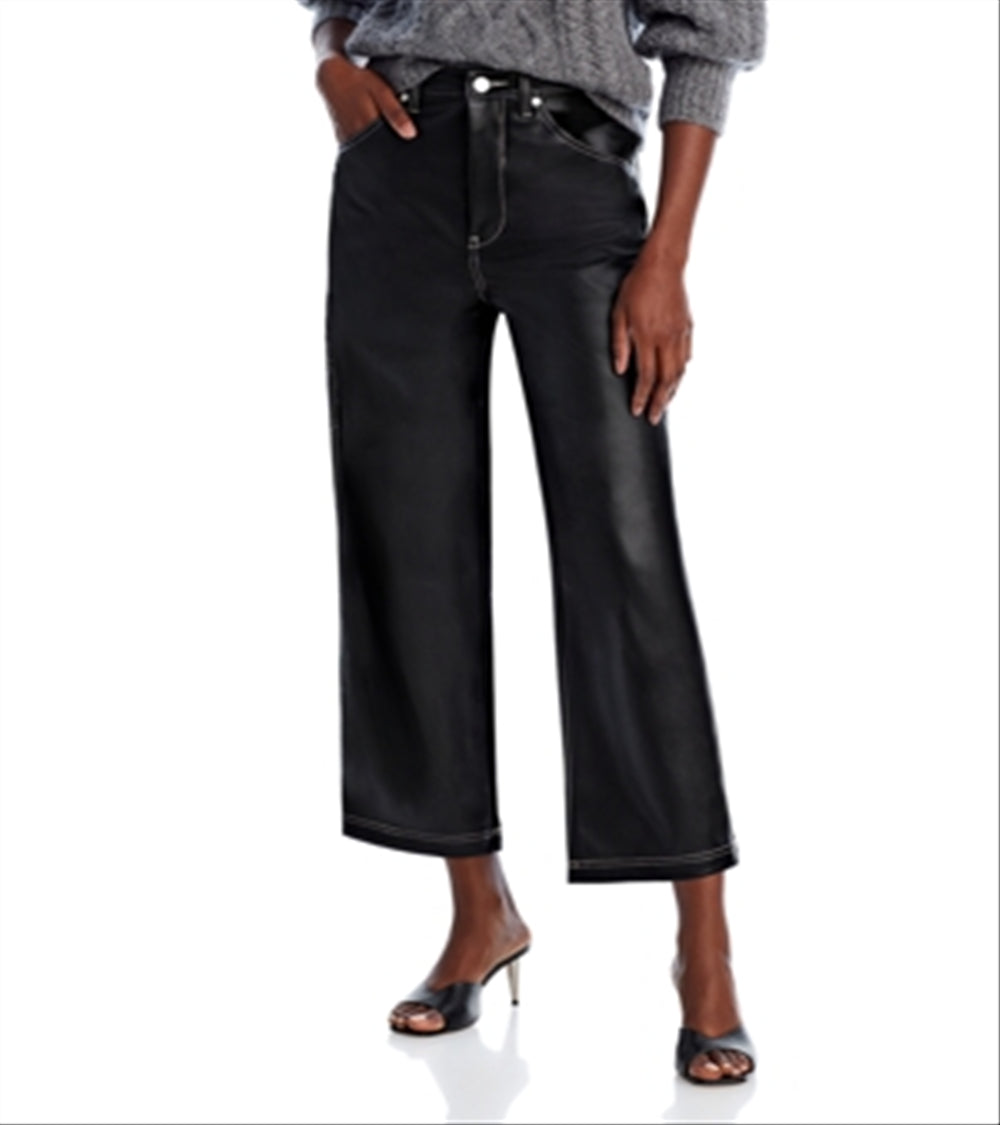 Calças femininas de perna reta | Couro sintético | Cropped | Cintura alta | Calças femininas de cintura alta | Material: 55% poliuretano/15% poliéster | China