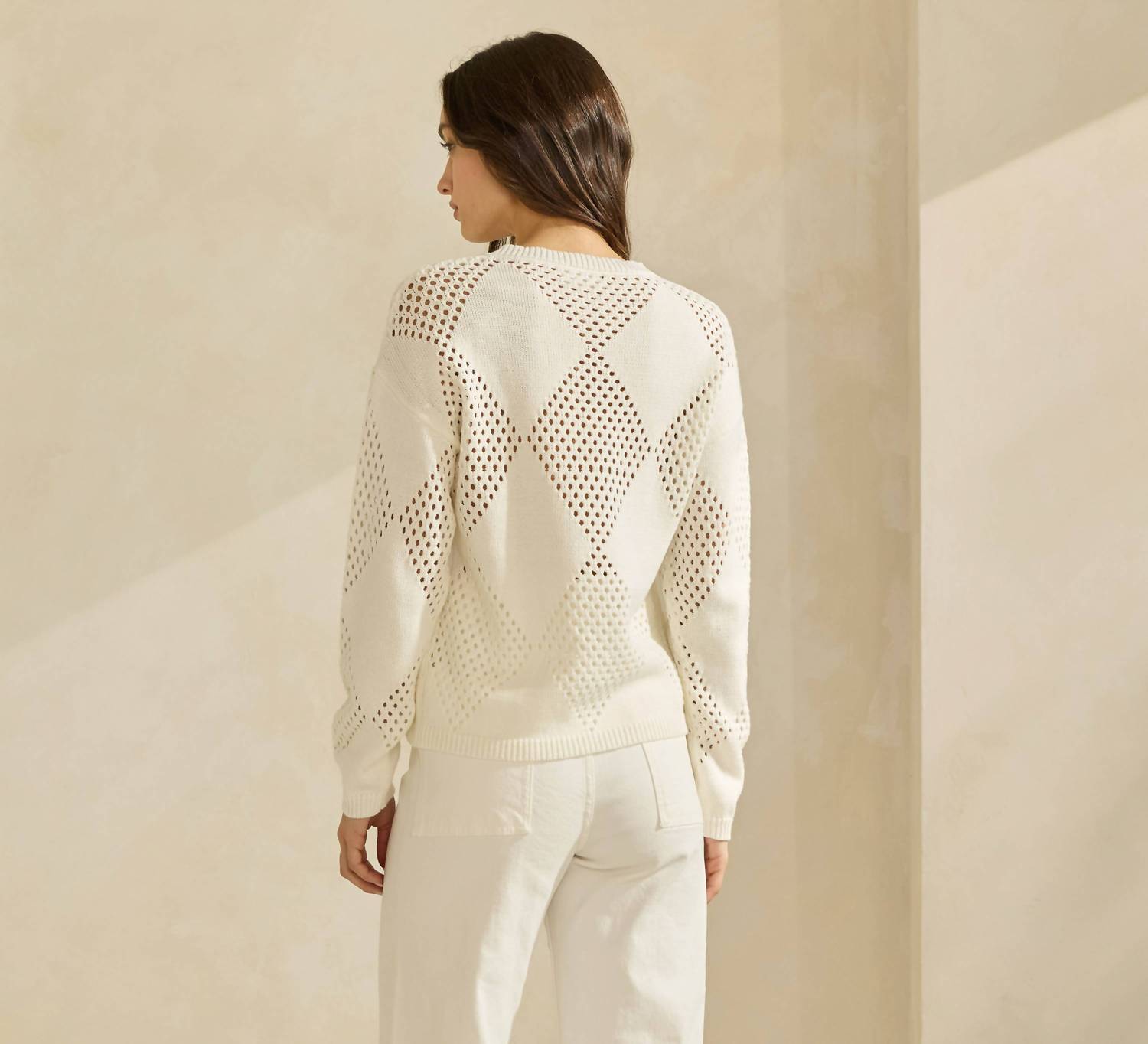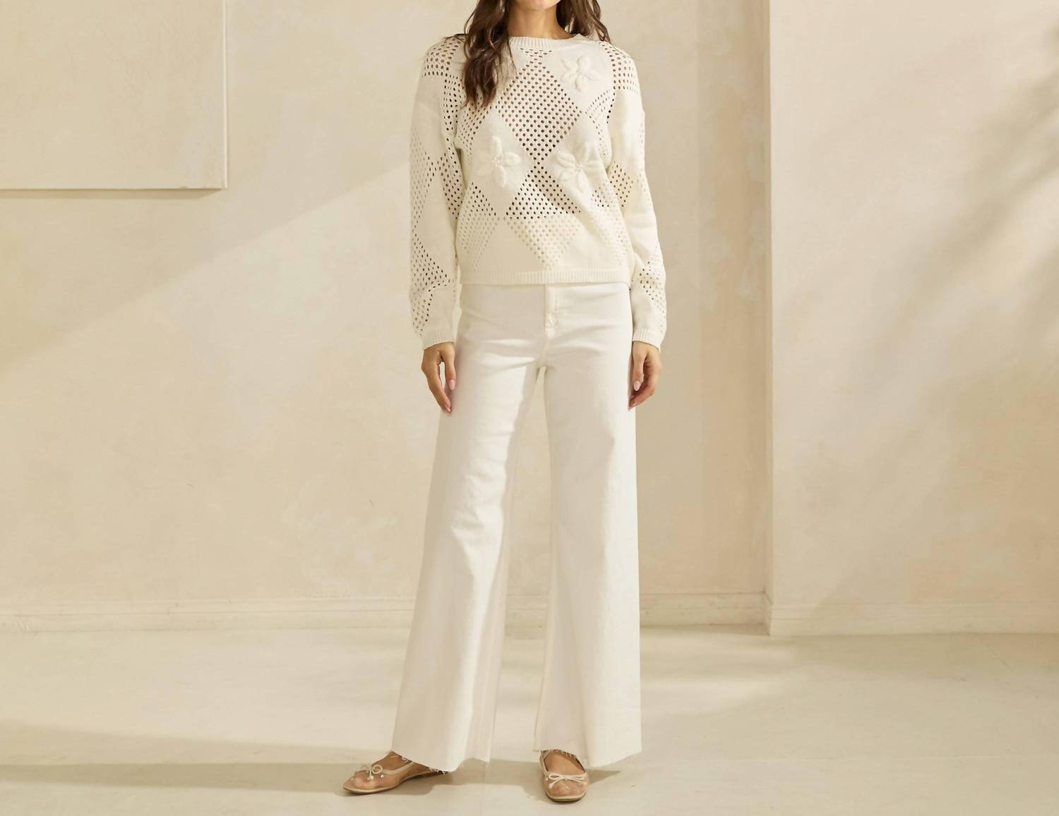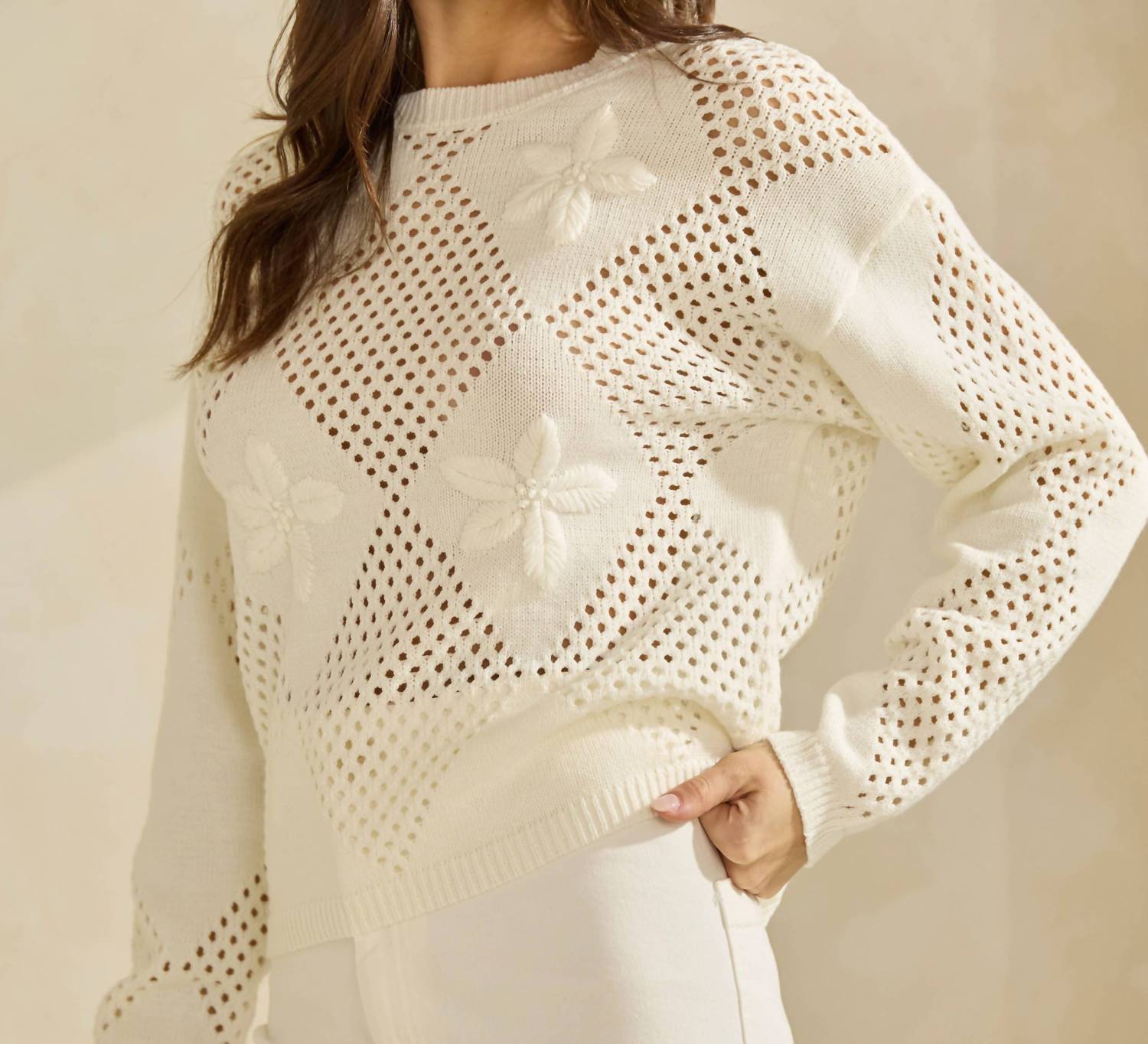 Introducing the Women's May Flowers Sweater Top by ABLE in a sophisticated cream hue, perfect for any minimalist wardrobe. With long sleeves and a crewneck, this pull-on cardigan showcases an exquisite textured diamond pattern with intricate floral embroidery and openwork details. Originating from an unspecified location, this luxurious piece is best suited for springtime vacations and leisurely occasions. Care instructions include machine wash and tumble dry. Model is 5'8" and wearing a US size small.