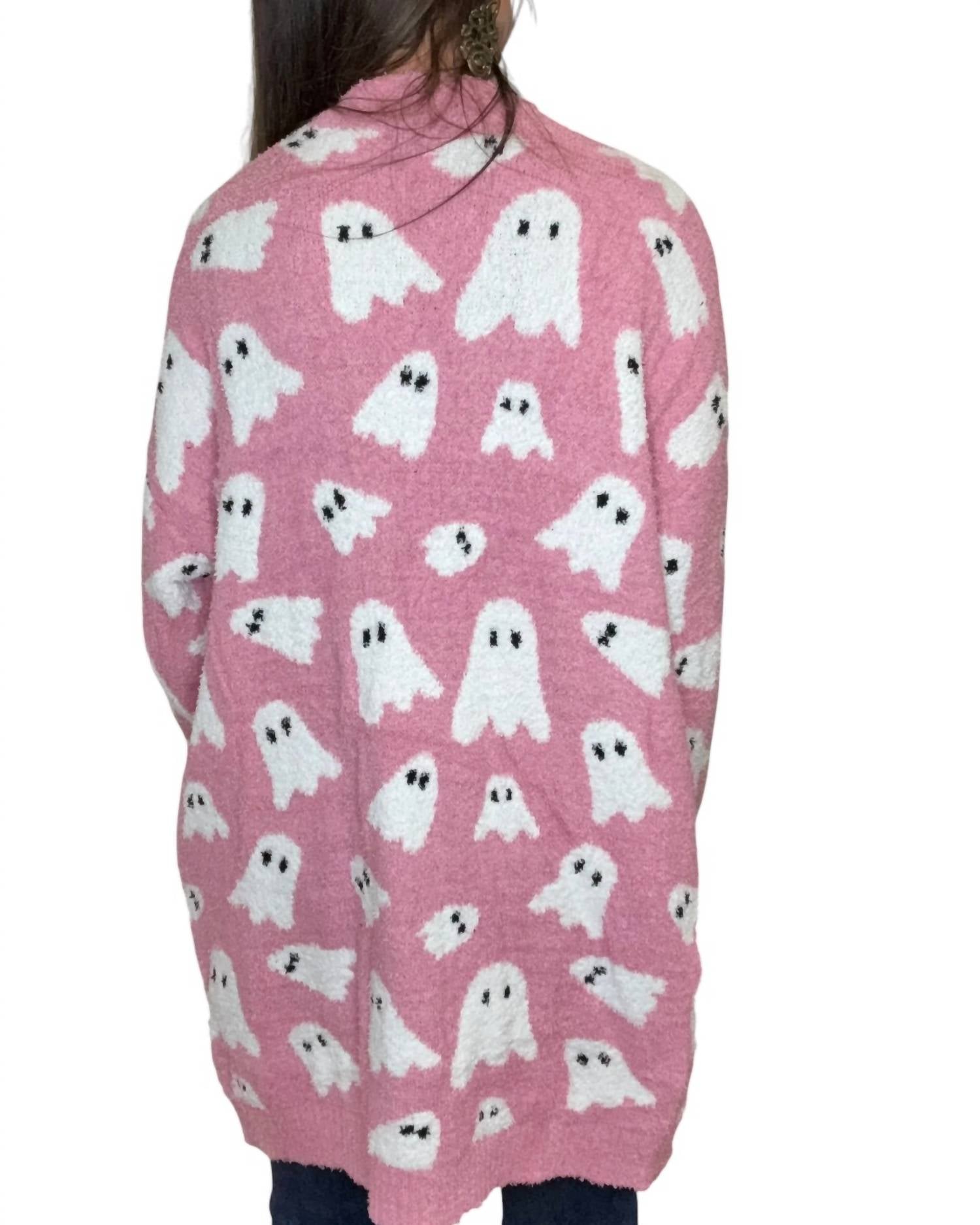 Meet the Halloween Ghost Cardigan by BLAKELEY, a versatile piece perfect for fall festivities or vacation getaways. This pink, long sleeve cardigan is crafted from polyester and offers a roomier fit to accommodate sizes from small to 3XL. Featuring a fuzzy sock feel, it is patterned with the cutest Halloween prints and equipped with side pockets for added functionality. Designed for easy wear with a pull-on closure, this cardigan is simple to care for with machine wash and tumble dry instructions.