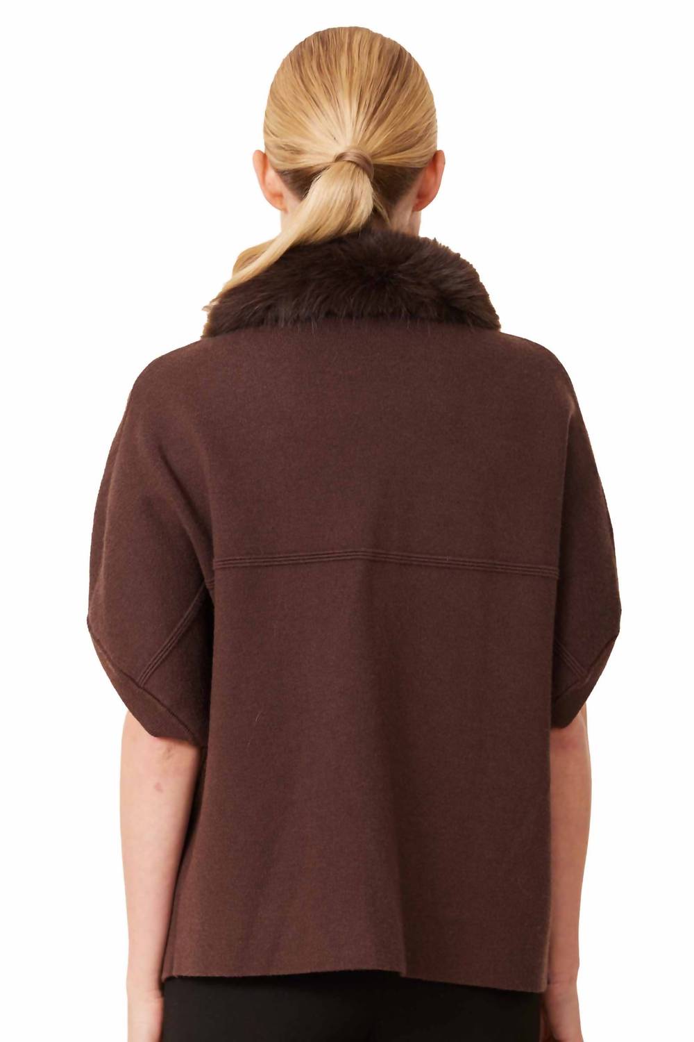 This cardigan will be a sweater-rotation favorite. Elevate your spring wardrobe with the Faux Fur Trim Cardigan by Dolce Cabo, an espresso-colored statement piece perfect for a dinner party. Featuring short sleeves and a detachable faux fur collar, this structured style combines elegance with a touch of maximalist flair. Crafted from a viscose blend for a soft knit finish, it features a convenient snap closure and front zip pockets. Composition details: Knit is 54% Viscose, 28% Polyester, 18% Acrylic; Faux Fur is 77% Acrylic, 14% Polyester, 9% Modacrylic. Care for the body by removing the faux fur and dry cleaning, while the faux fur should be dry cleaned only. Model is 5'8" wearing a size small/medium.