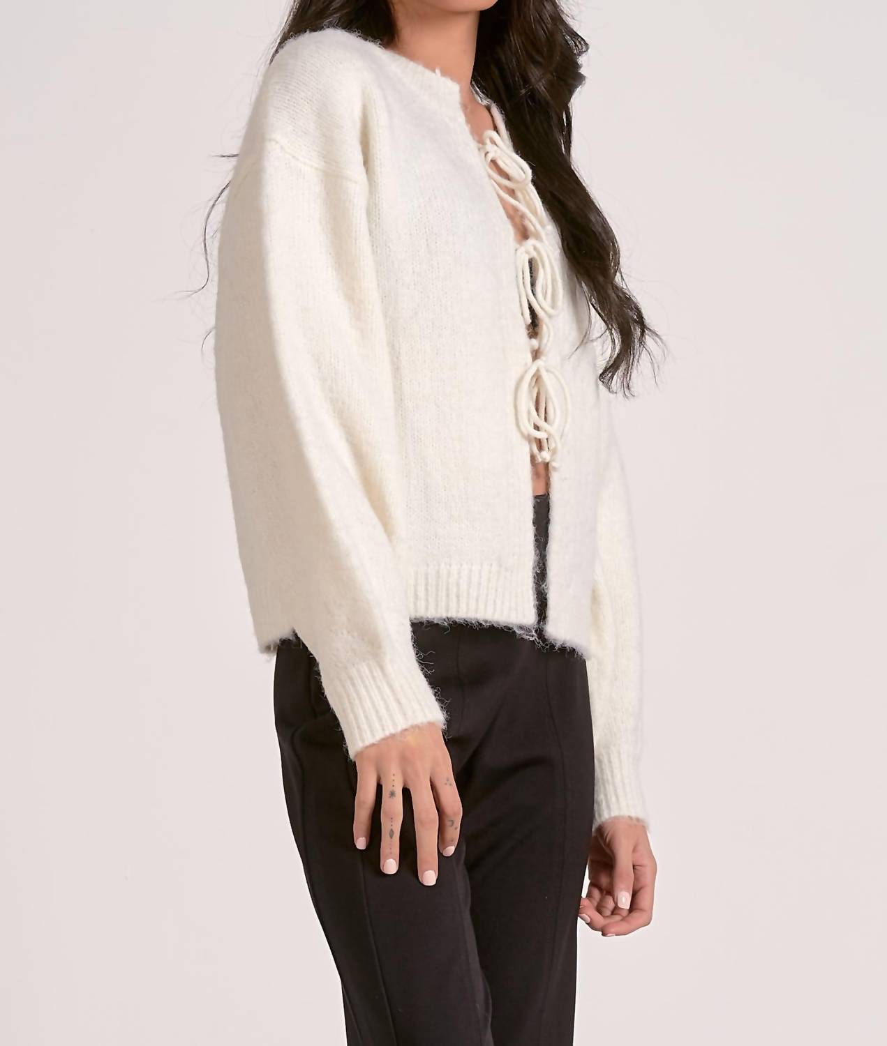 This cardigan will be a sweater-rotation favorite. Discover the Marienne Sweater by ELAN, a chic addition to your autumn wardrobe in elegant stone. This cardigan showcases long sleeves and an eye-catching textured pattern, crafted from a comfortable nylon blend. It features a crewneck design and a front tie closure for a feminine silhouette. Perfect for Thanksgiving celebrations or monochrome birthday looks.