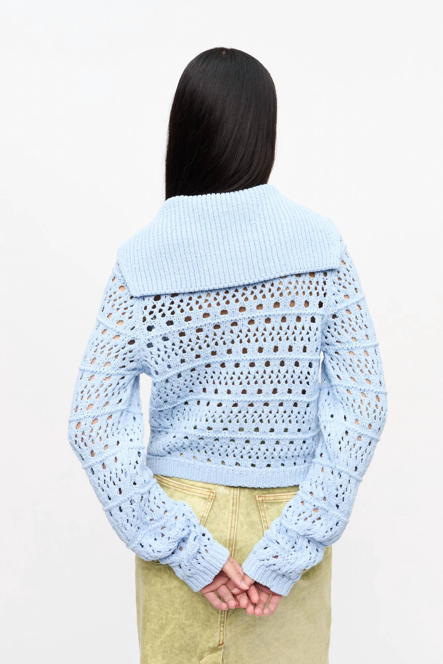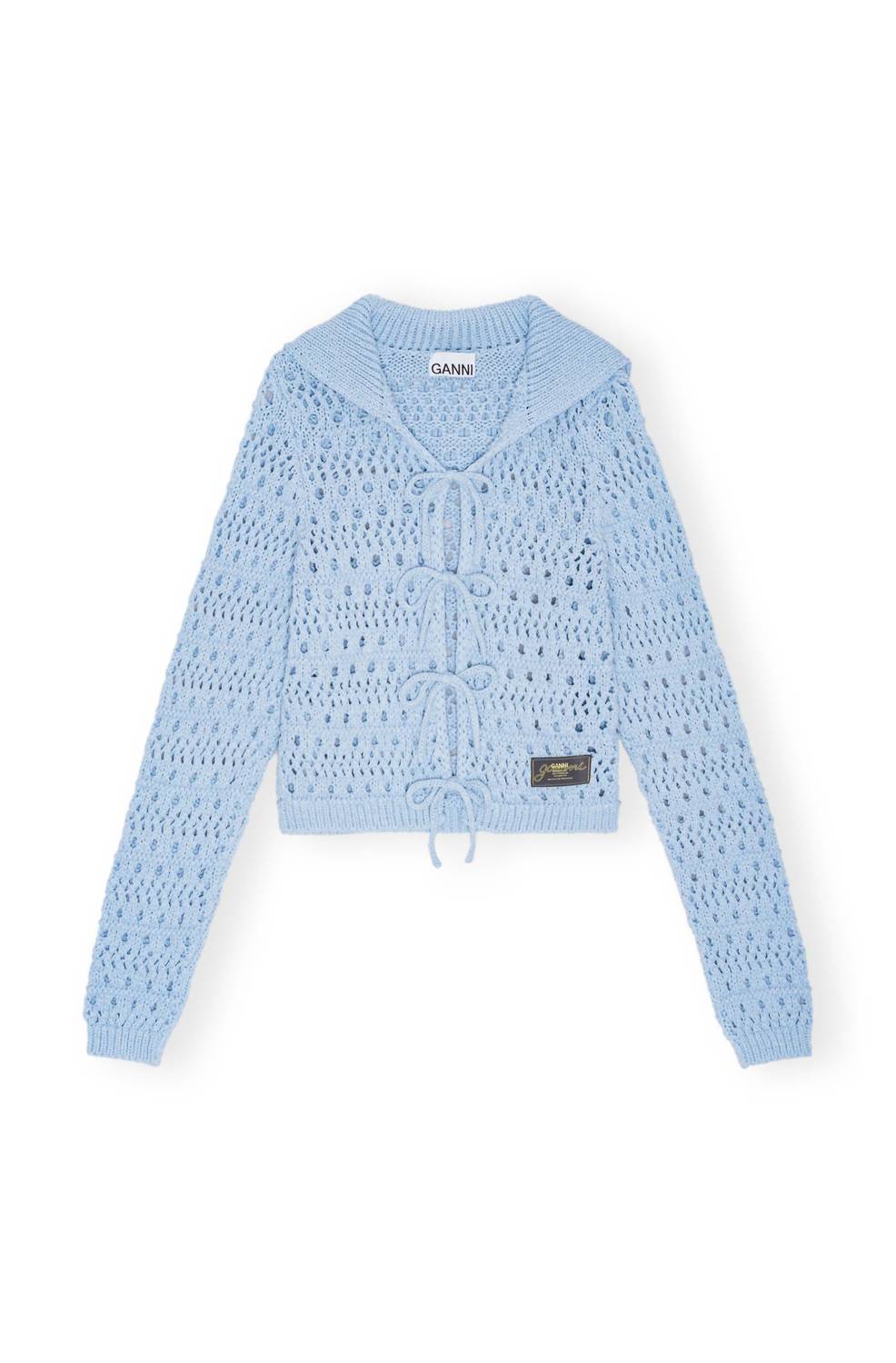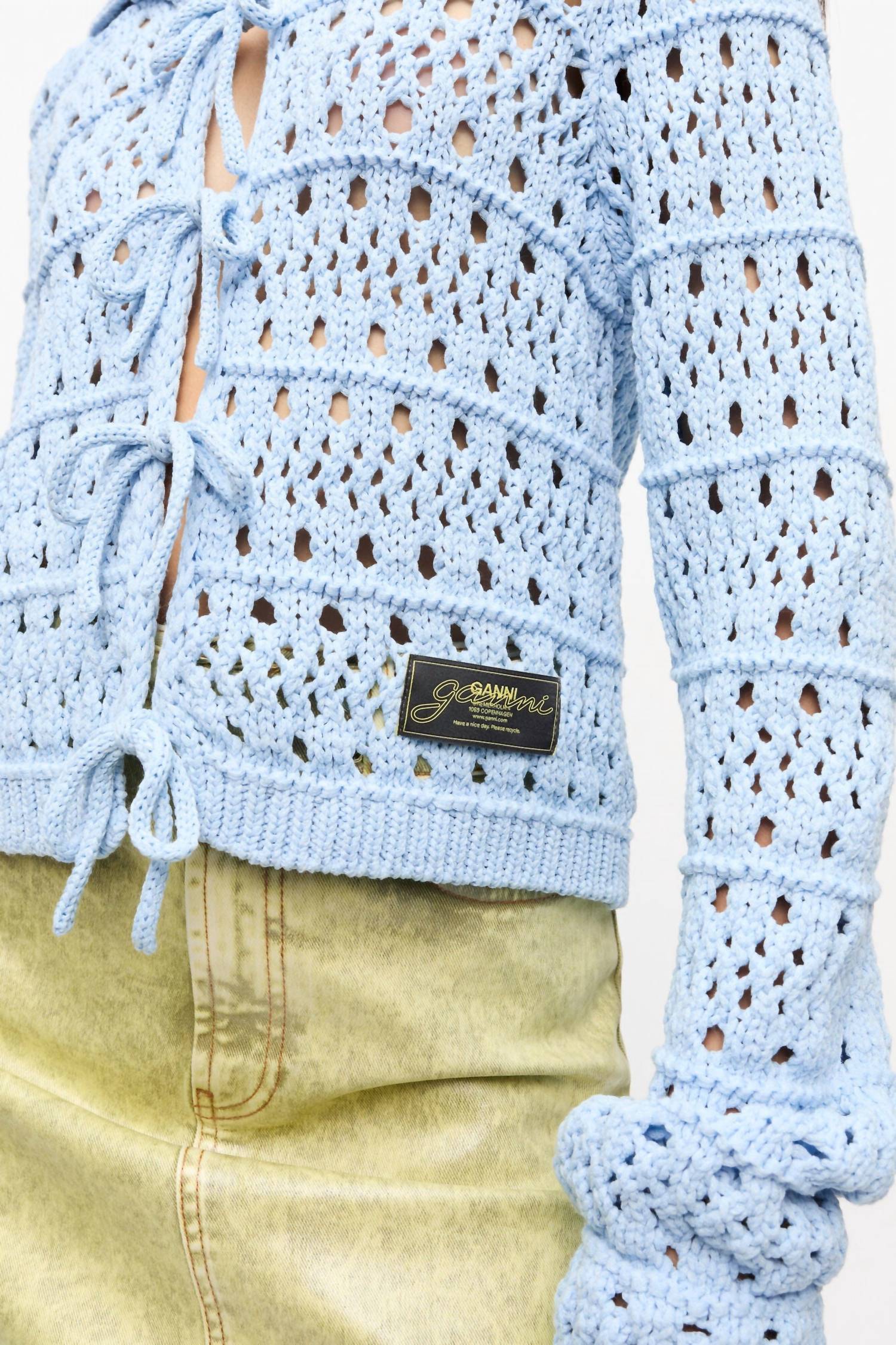 The Cotton Mix Tie String Cardigan by GANNI is a chic addition to your vacation wardrobe, exuding a boho style in Soft Chambray. This cardigan features long sleeves and a stylish large collar, crafted from a cotton blend composition of 50% recycled cotton and 50% recycled polyester. It is designed with a tie closure at the front, accentuated by three tie bands, and includes a sewn-on GANNI logo patch. Originating from Moldova, it requires hand wash care and should be laid flat to dry.