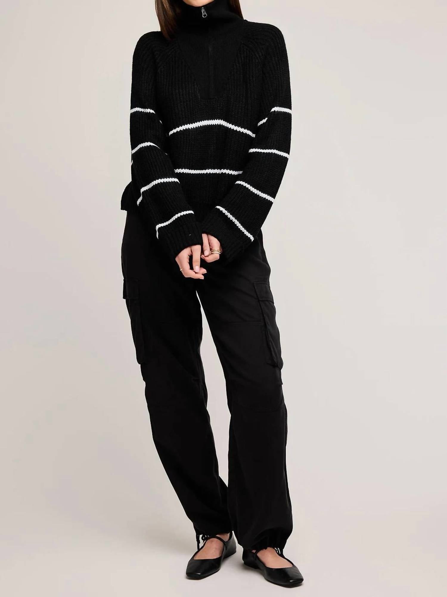 The Women's Declan Top by Gentle Fawn is a black cardigan crafted for maximalist style with a half cardigan stitch and stripe pattern. Featuring long sleeves and a turtleneck design, it offers a relaxed fit perfect for vacation occasions. Made from 97% acrylic and 3% nylon, this piece includes a metal front zipper closure and folded cuff detail. Care instructions recommend machine washing for easy maintenance.