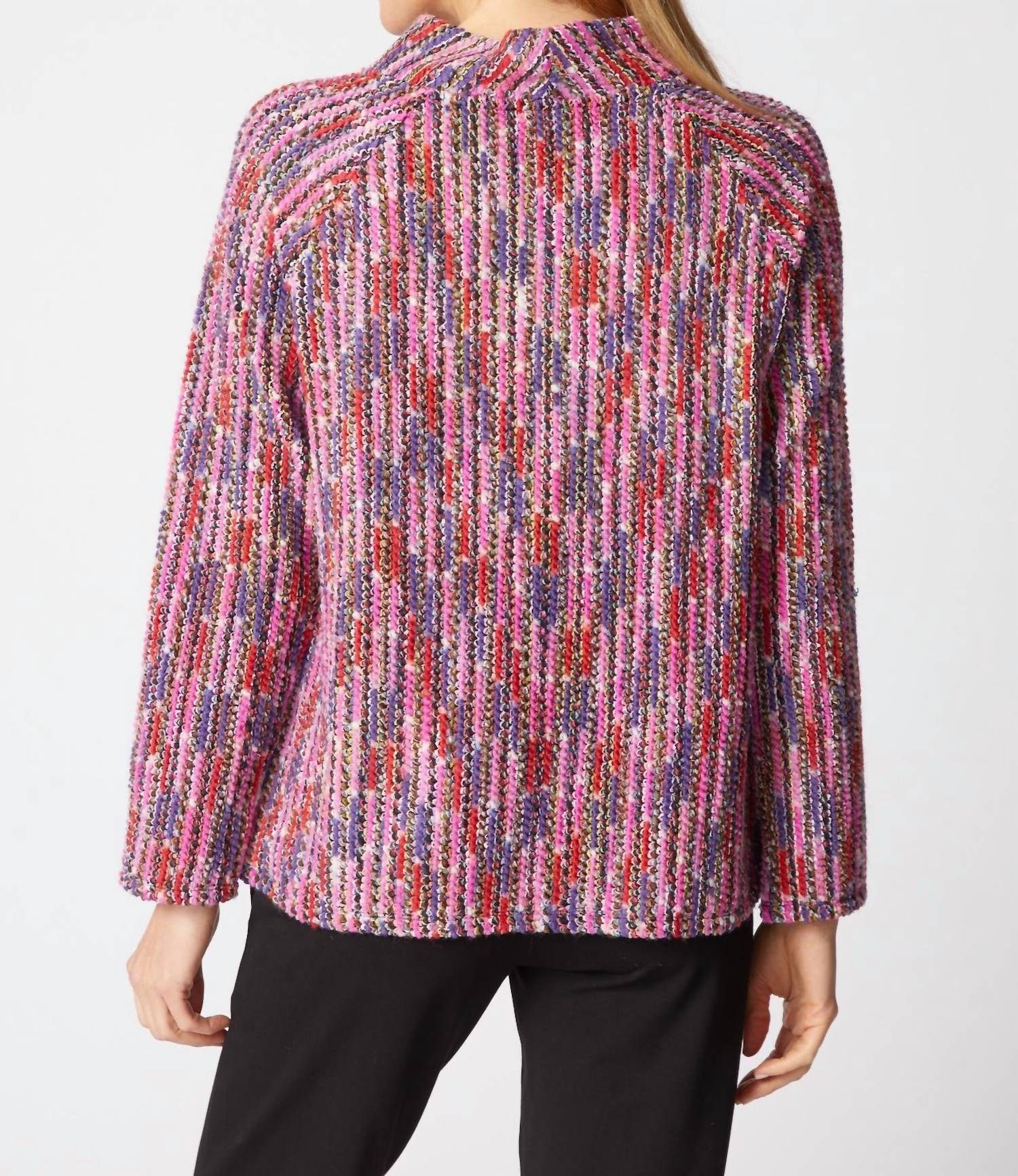 Introducing the Mosaic Knit Cambridge Pullover by Habitat, a colorful and textured piece designed to effortlessly complement any wardrobe. With its long raglan sleeves and mock neck, this pullover showcases vibrant boucle yarns in a relaxed fit. Composition: 57% Acrylic, 43% Polyester. Length: 24" in front and 23.5" in back for size small. Closure: Pull on. Care: Machine wash cold with like colors, tumble dry low, and cool iron if necessary. Perfect for travel, this cardigan features practical front pockets and a maximalist design, ideal for the fall season. Model is 5’9” wearing a size small.