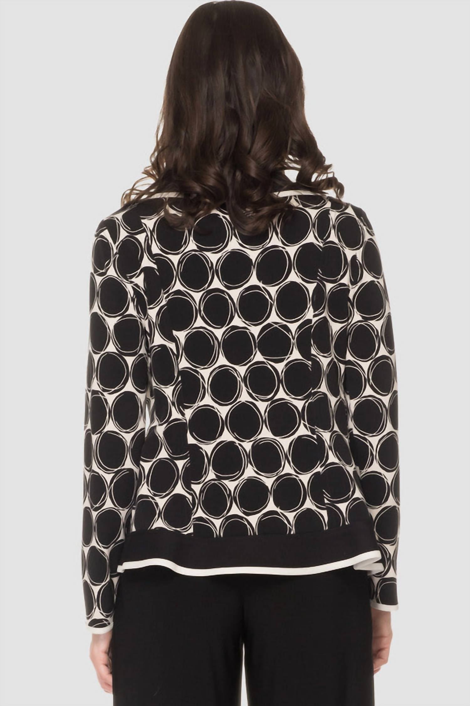 For a touch of elegance, the Graphic Circle Print Cardigan by Joseph Ribkoff showcases a striking graphic print design in timeless black and beige. This stylish cardigan features full-length sleeves, open front with ruffled trim, and a chic collar. The cleverly constructed printed knit, Milano, and Georgette blend comprises 95% Polyester and 5% Spandex, offering a flattering fit accentuated by a curved hem that gracefully hits at the hip. With a pull-on closure and an approximate length of 27" for size 12, this piece is ideal for your festive gatherings. Model's height is 5'10", wearing a size 6.