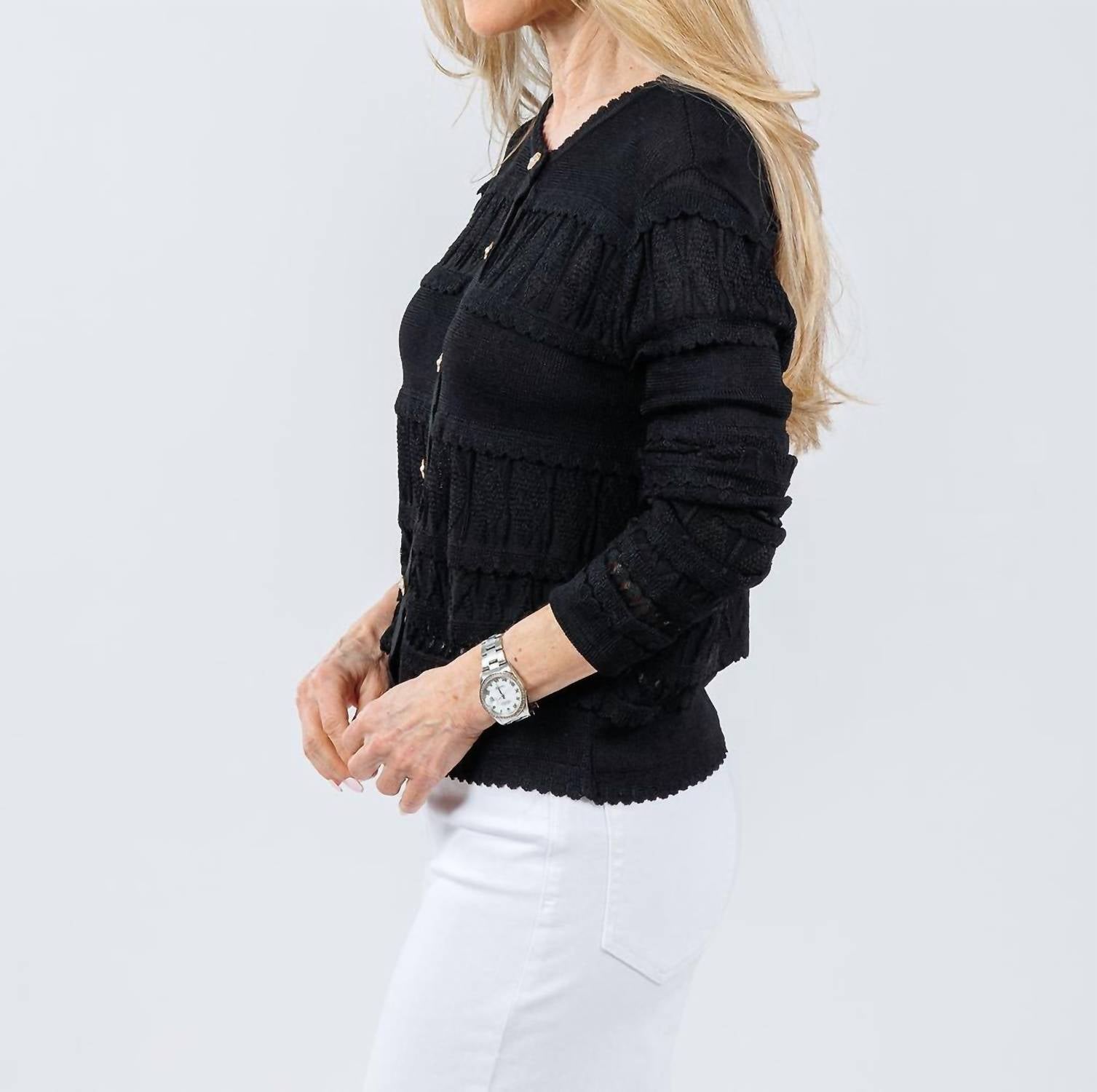 Introducing the Women's Ross Fringe Cardigan by Maria Pavan, an elegant layer designed for a touch of sophistication. This black knit cardigan features long sleeves and alternating bands of openwork with soft fringe, enhanced by gold-rimmed buttons and scalloped edges. Composition: 80% Viscose, 20% Polyamide. Closure: Button front closure. Model wears a size M, standing at 5'6" with measurements 34" bust, 25" waist, 34" hip, and 28" inseam.
