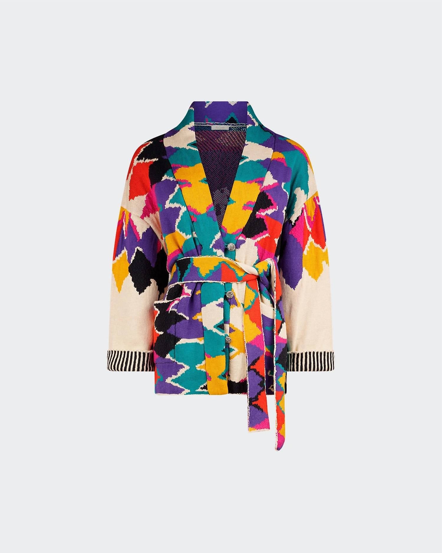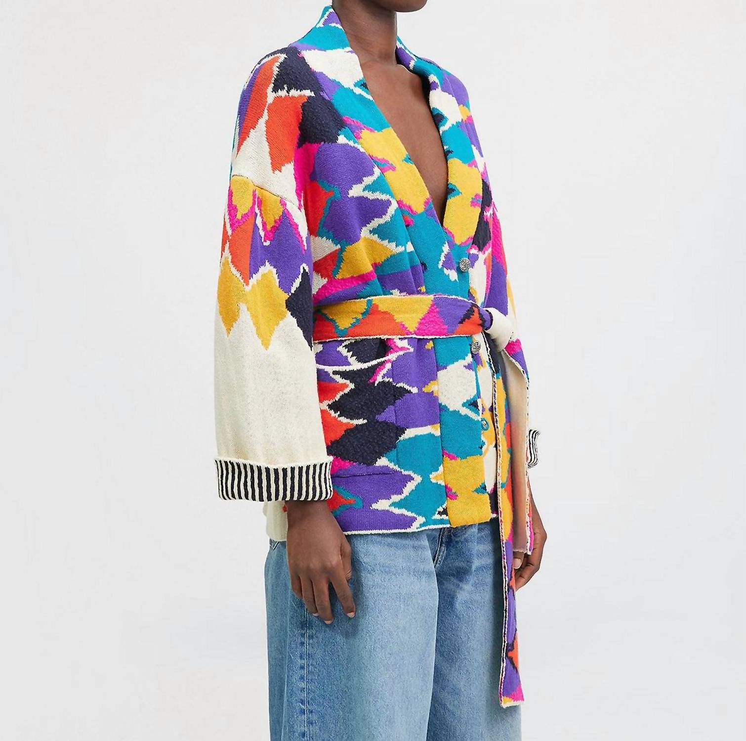This cardigan will be a sweater-rotation favorite. Elevate your style with the Athan Cardigan by Mes Demoiselles, beautifully crafted in a cotton blend with a geometric jacquard pattern. This long sleeve piece features a unique blend of 76% Cotton, 10% Horsehair, 9% Linen, and 5% Polyester and comes in an elegant ivory hue. Designed with a button closure and an included belt to enhance your silhouette, it effortlessly complements your holiday party attire. With a nod to Y2K trends, this cardigan's kimono-inspired sleeves and v-neckline add a chic touch.