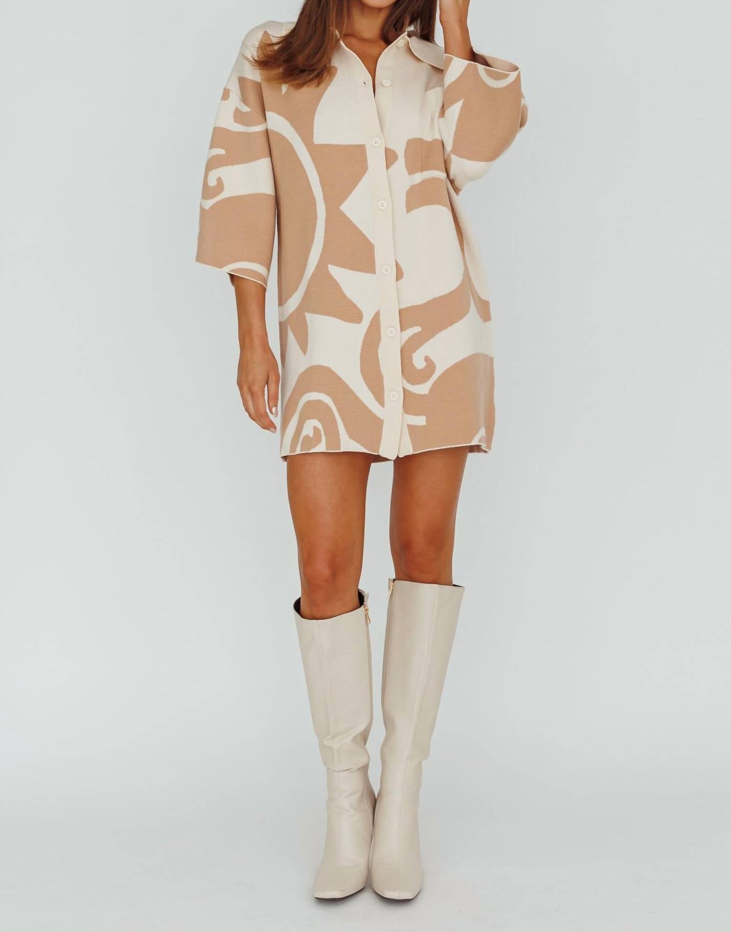 Elevate your travel wardrobe with the Moda Borboleta Button Up Knit Shirt Dress in a chic Sand Wood pattern. This women's dress features three-quarter sleeves for a comfortable fit, crafted from a soft viscose blend. Designed with a stylish collar, it offers a button closure, embodying boho chic ideal for fall occasions like Thanksgiving. For the best care, simply hand wash the dress.