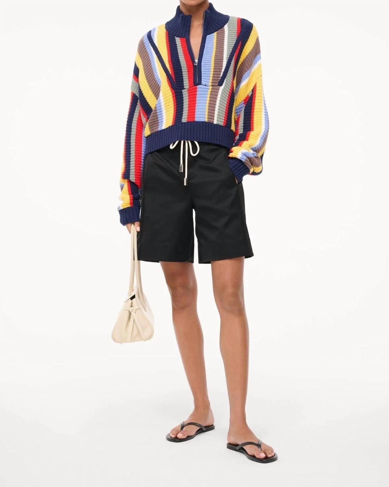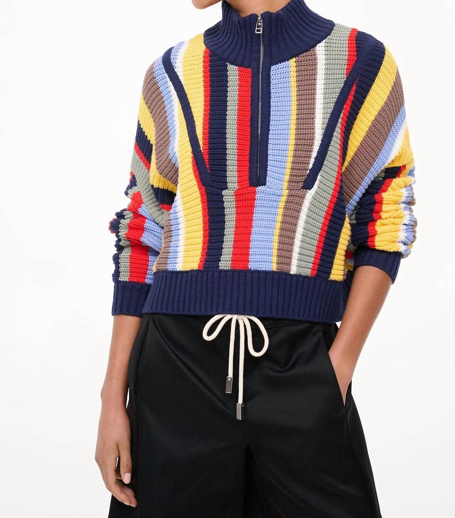 Meet the Staud Cropped Hampton Sweater, a trendy addition to your summer wardrobe, featuring stylish Market Stripe patterns. This women's cardigan offers long sleeves and a chic mockneck detail, making it perfect for vacation wear. Expertly crafted with a chunky cotton knit, it boasts a practical half-zip closure for easy layering. Care instructions recommend hand washing and laying flat to dry, ensuring long-lasting wear.