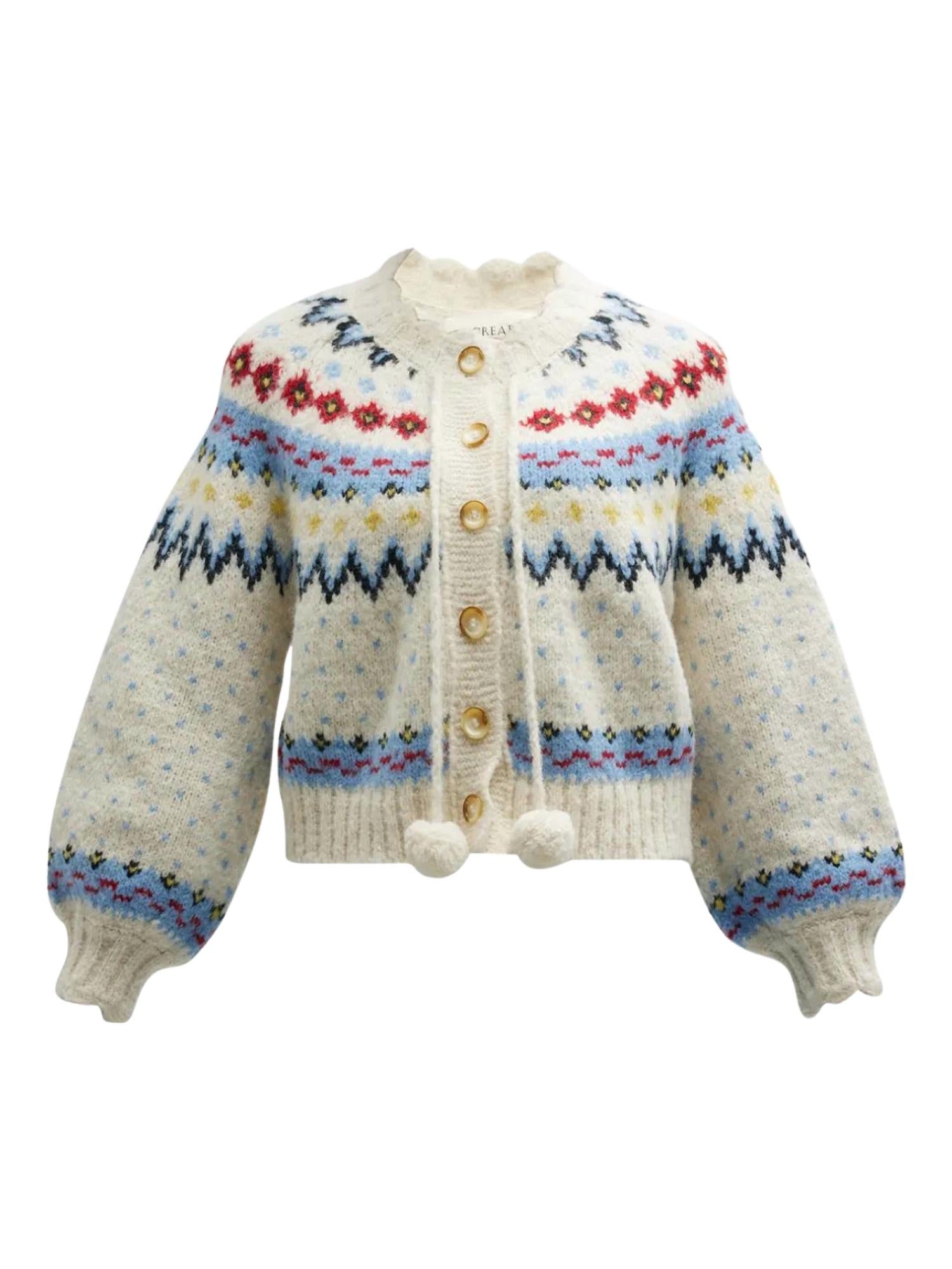 Introducing the Ice Rink Cardigan by THE GREAT., a winter must-have in a charming beige Fair Isle pattern perfect for festive occasions. This cardigan boasts long blouson sleeves, crafted from 89% superfine alpaca and 11% polyamide, ensuring warmth and comfort. It features a button closure with authentic horn details, complemented by a scalloped mockneck and pompom embellishments. For care, hand wash cold and lay flat to dry to maintain its timeless appeal.
