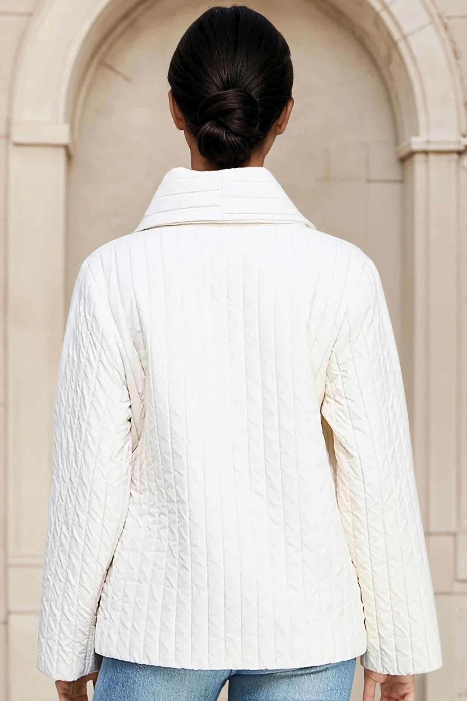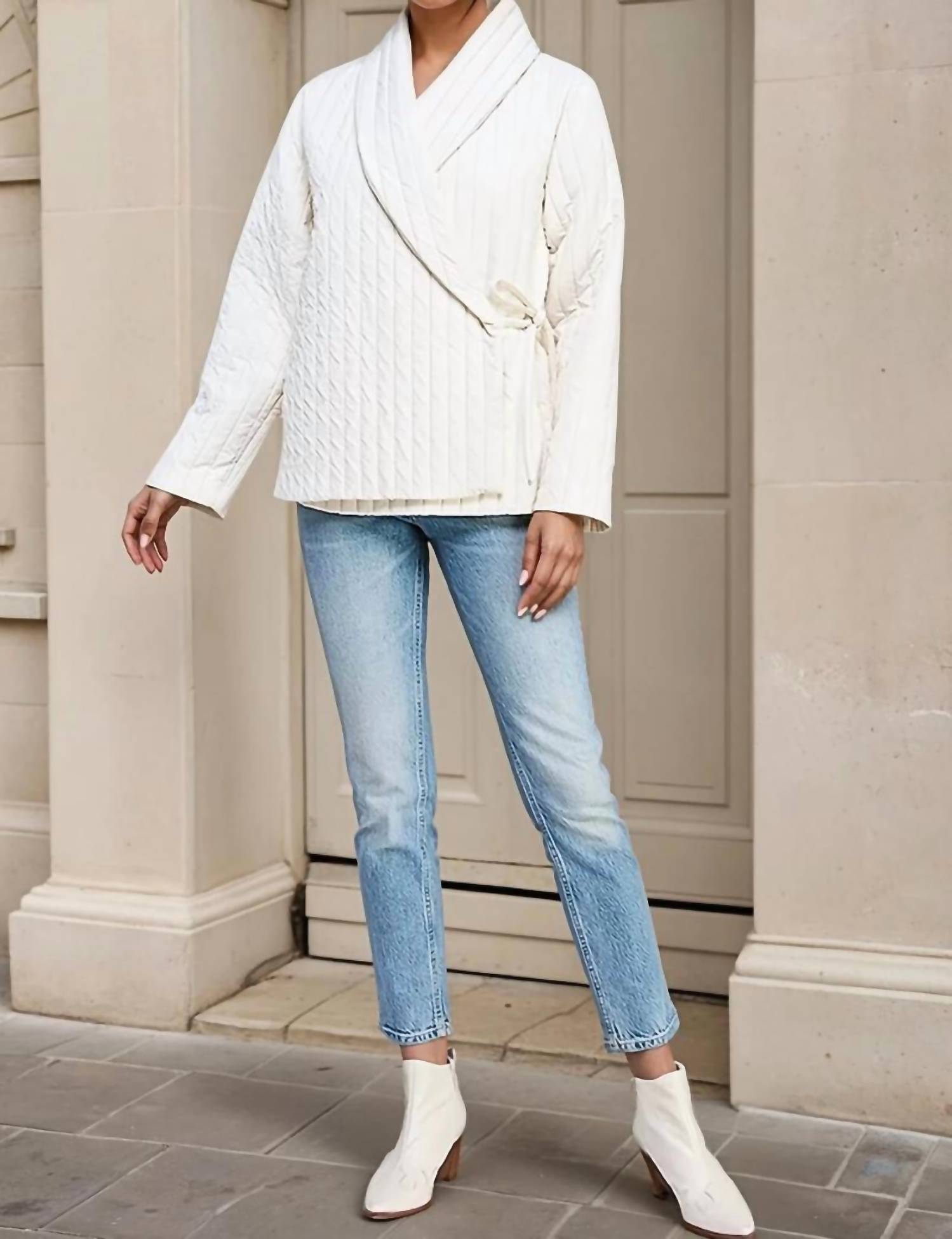 Introducing the Ophelia Quilted Wrap Tie Jacket by ALLIE ROSE, a staple for modern elegance in a crisp ivory hue. This long sleeve jacket features a wrap-front design with a tie closure, offering a flattering and adjustable fit. Crafted for comfort and warmth, its softly padded texture and vertical quilted detailing bring a refined structure. Care: Machine wash and tumble dry, ideal for effortless maintenance.