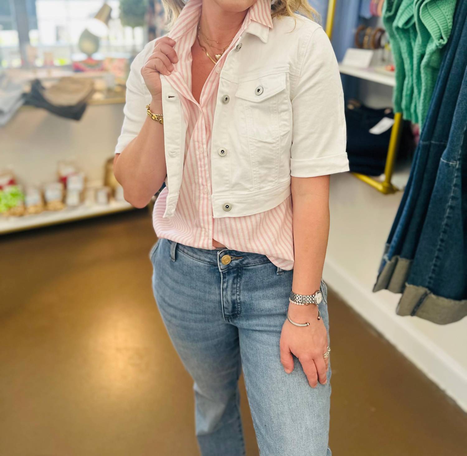 Bonita, casual e confortável. Esta jaqueta é um item essencial. Adicione um toque de estilo ao seu look com a Jaqueta Jeans Cropped da Charlie B, uma combinação perfeita de estilo e conforto. Esta jaqueta jeans branca possui mangas curtas dobradas e bolsos frontais práticos no peito, para um visual moderno e jovial. Seu fecho de botão e estampa lisa a tornam uma escolha versátil, aprimorando seu guarda-roupa de primavera e verão. Ideal para usar nas férias, esta peça complementa qualquer look casual com seu design de gola redonda e caimento cropped prático.