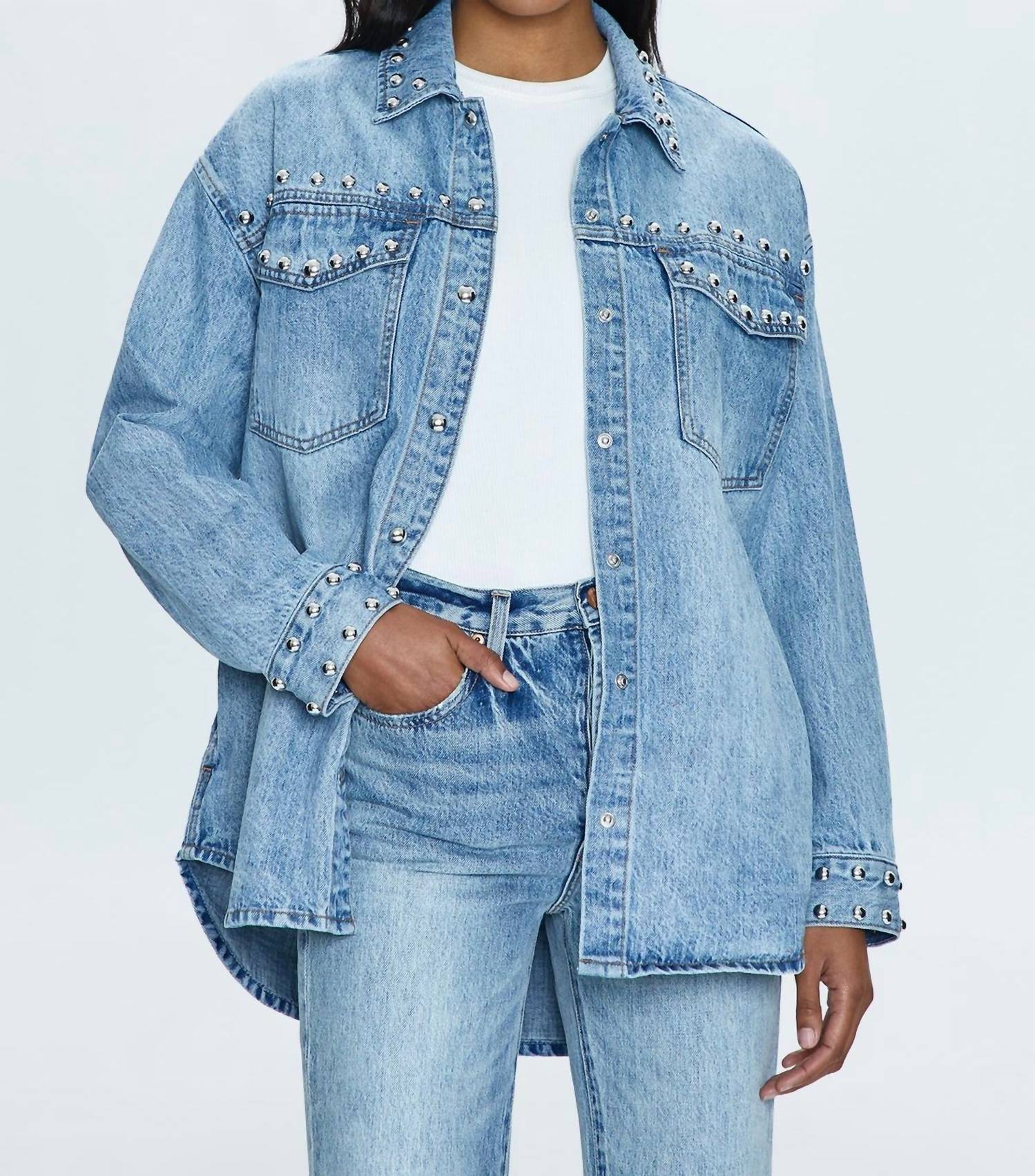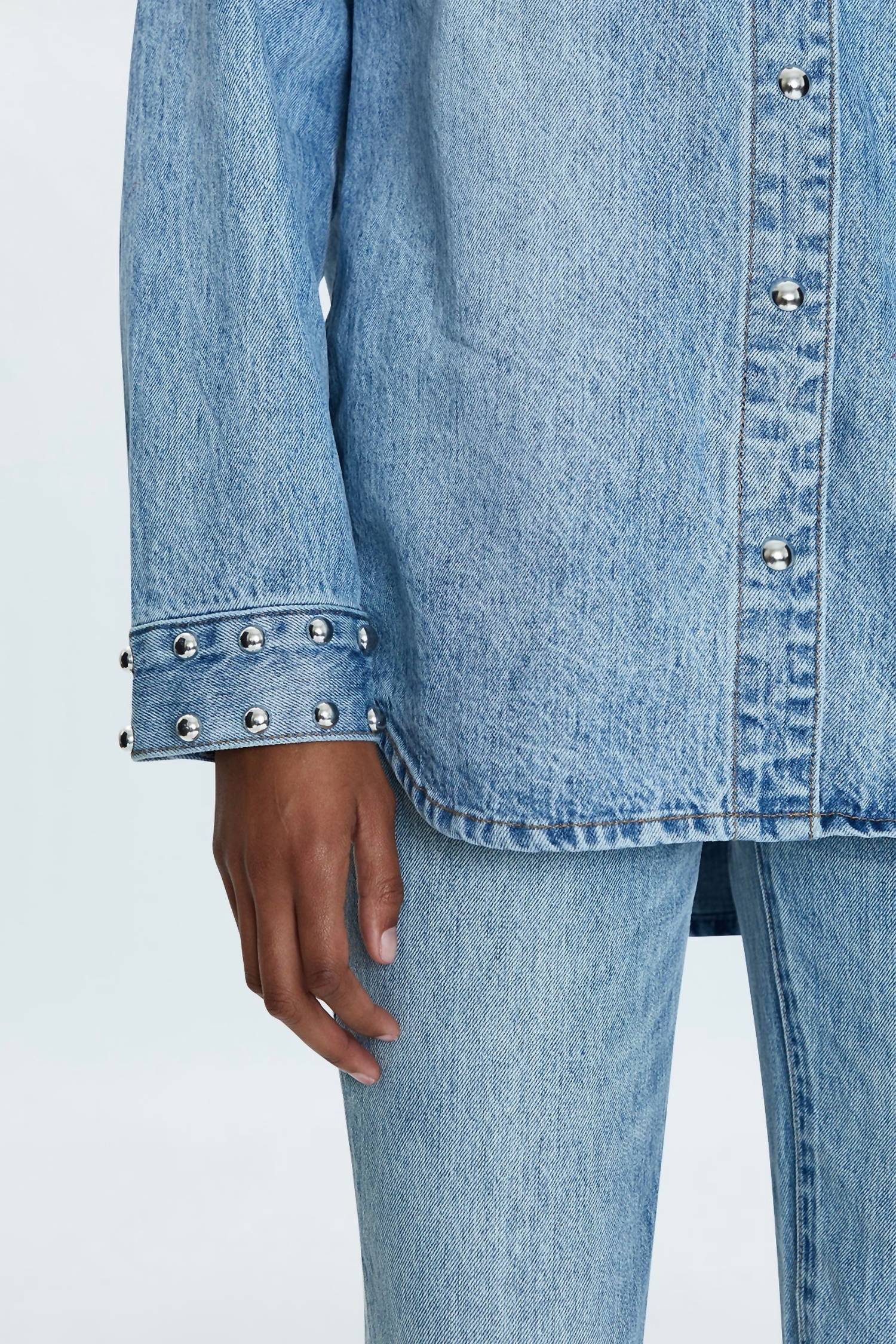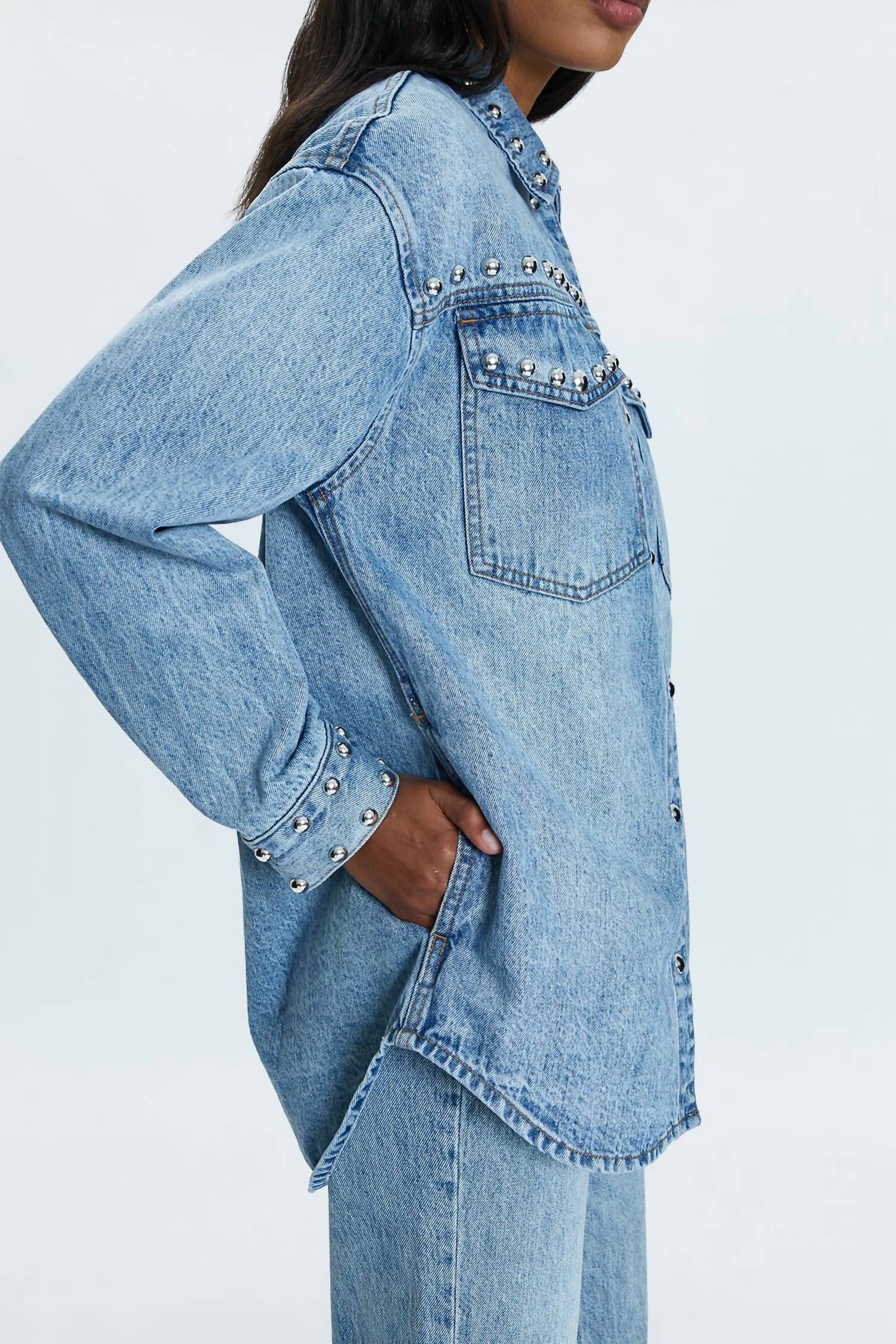 Uma jaqueta casual e descolada que todo guarda-roupa precisa. Eleve seu guarda-roupa com o Mandy Oversized Shacket da PISTOLA, um shacket inspirado na moda masculina, perfeito para viagens e passeios no Dia das Mães. Confeccionado em 100% algodão com lavagem Satellite azul-claro, esta peça versátil apresenta mangas longas, gola careca e fecho frontal por botões. Com 76 cm de comprimento, é adornado com tachas lineares para um toque de estilo streetwear. Embora as instruções de cuidado não sejam explicitamente fornecidas, recomenda-se a lavagem a seco para manter seu apelo elegante.
