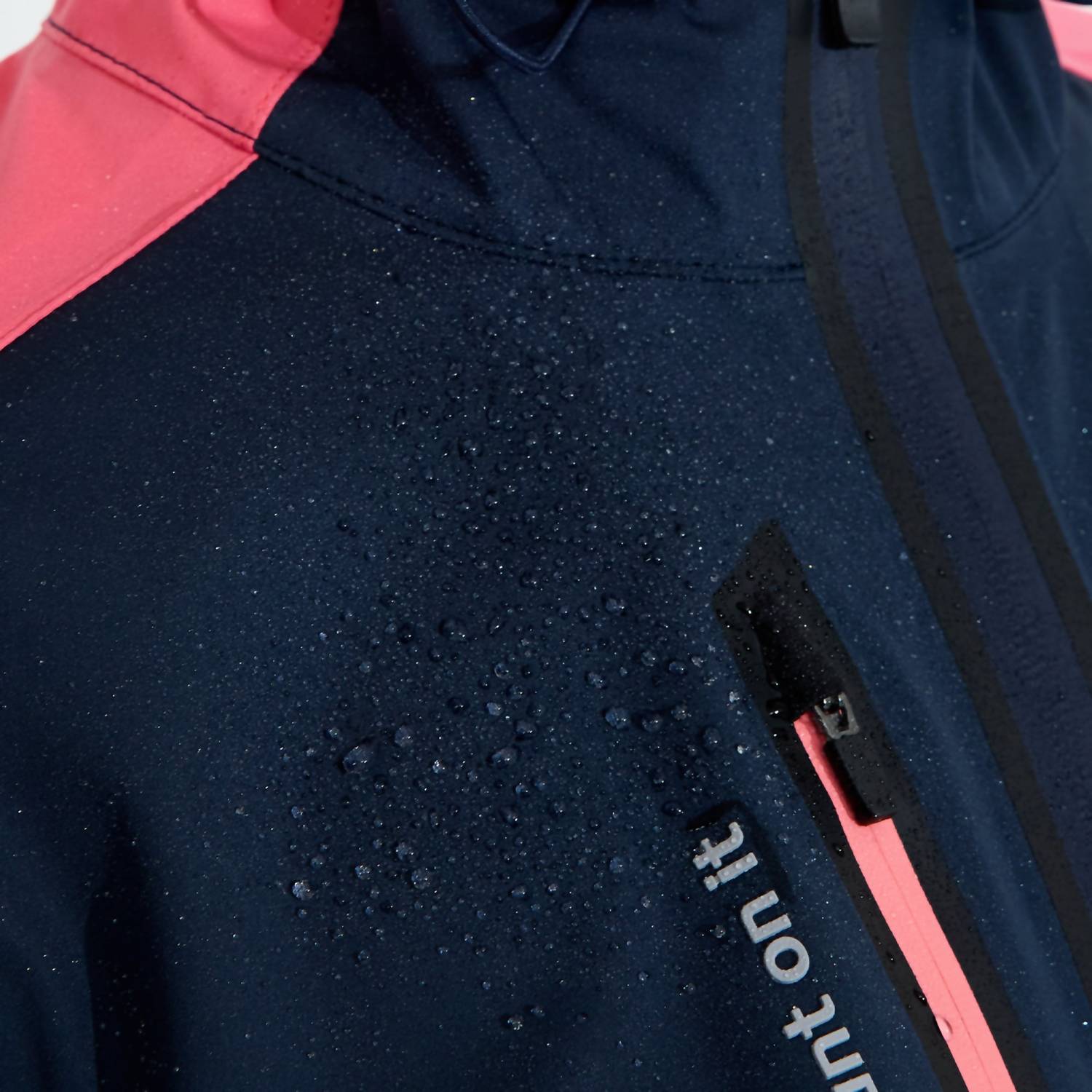 Introducing the Bounce Rain Jacket by Abacus Sportswear US, a high-performance utility jacket crafted for athletic pursuits. This navy and lipstick-hued piece features long sleeves and is made from 4-way stretch polyester, ensuring both waterproof capabilities and breathability. Designed with a functional zip closure, it offers practical features such as a mock neck and multiple pockets for added convenience. Care is easy with machine washability and line dry instructions, making it an ideal choice for game day adventures.