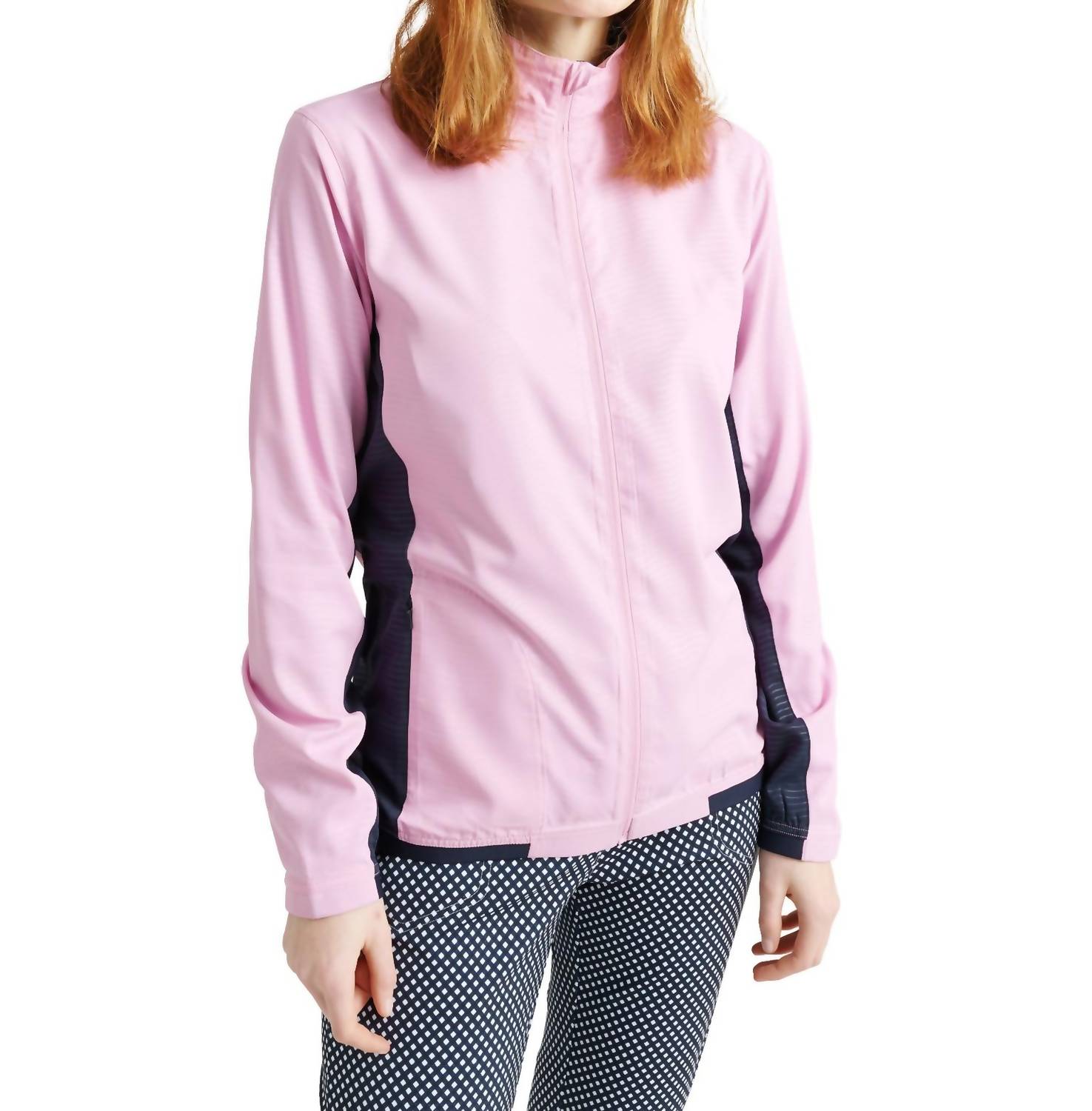 The coolest, most versatile utility jacket. Match it with your favorite pair of denim or throw it over any day dress. Introducing the Lanark Stretch Wind Jacket by Abacus Sportswear US, an athleisure essential designed for game day. This women's utility jacket in Navy Peony features long sleeves, elastic edging, and a practical full zipper closure, complemented by a mock neck and discreet pattern. Crafted from recycled materials, it weighs just 5 oz (157g) and promises windproof comfort. Care instructions include machine wash and lay flat to dry.