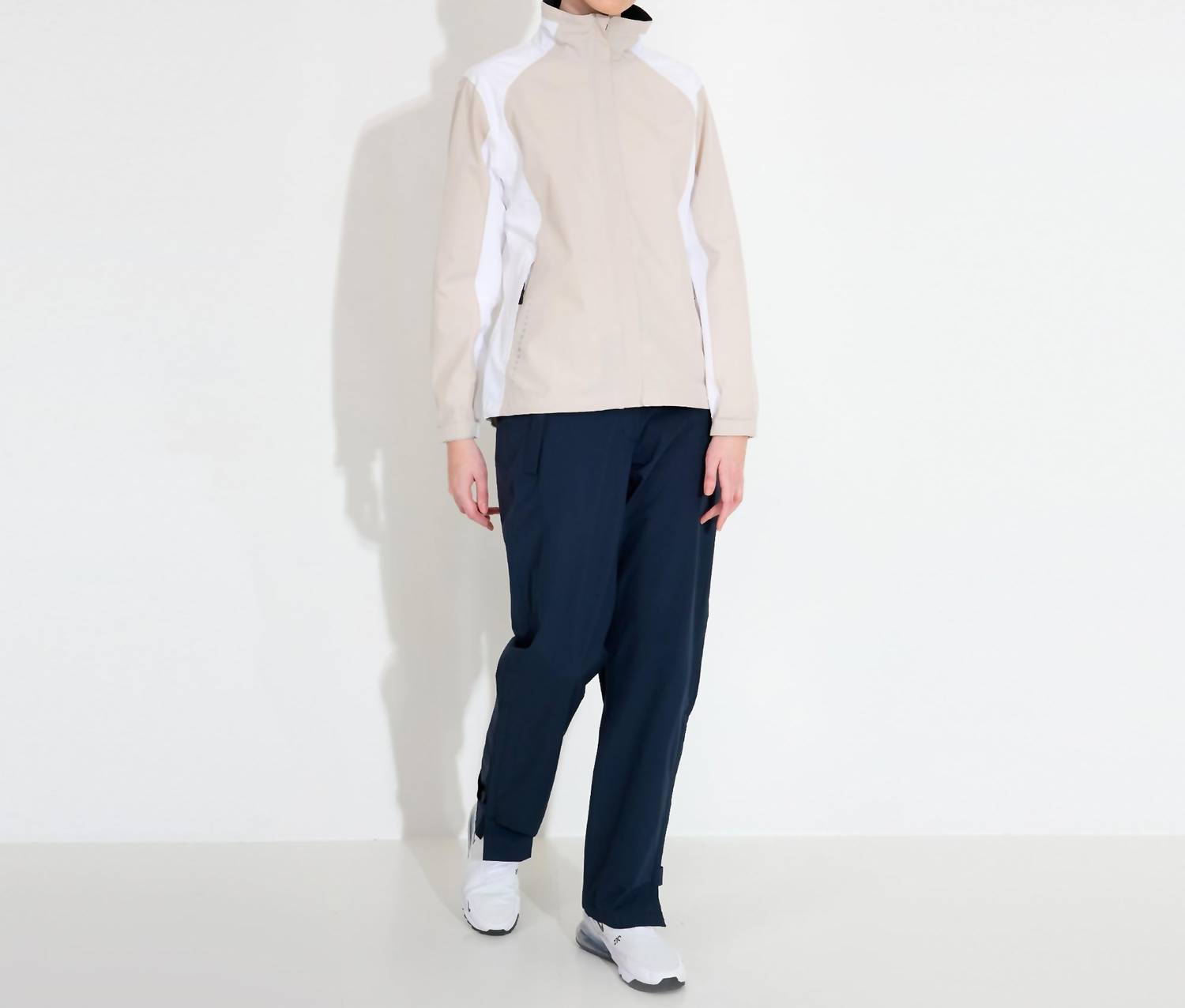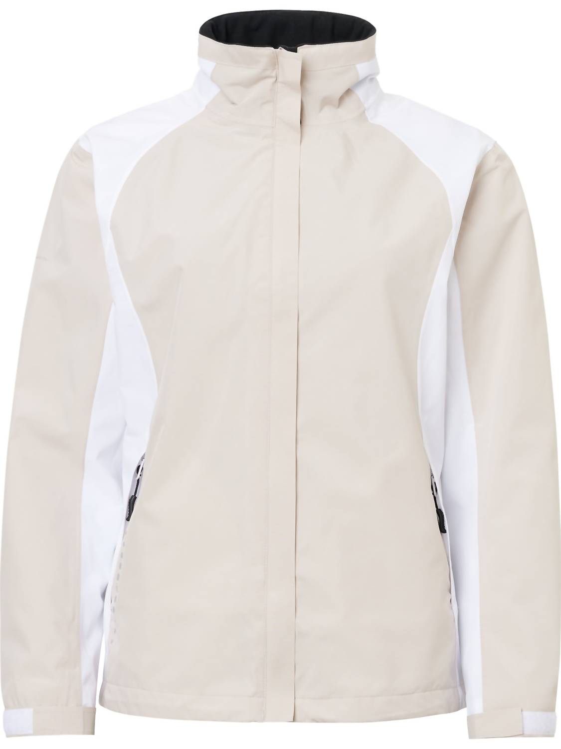 The ultimate cool-girl utility jacket. Introducing the Links Stretch Rain Jacket by Abacus Sportswear US, designed for utility and style in the soft Sandshell color. This women's long sleeve jacket is crafted from a 2-way stretch, waterproof fabric that's PFC-free and offers breathability with taped seams and a mesh lining for comfort. Featuring a mock neck with drawstring adjustment, side pockets with zip closures, and reflective details for added visibility. Closure: Zip closure. Care: Machine wash and line dry. Sofia is 178 cm/5'8" and wearing a size Medium.