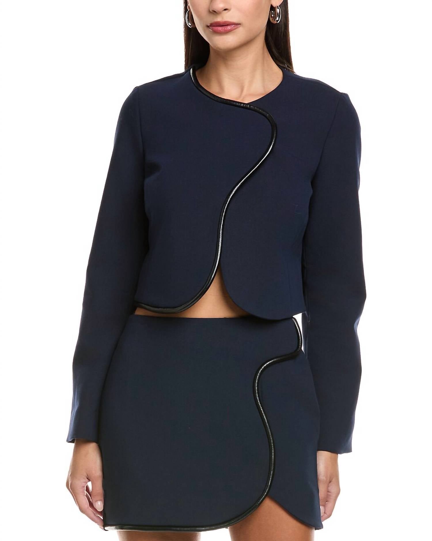 Elevate your style with the Andie Jacket by Amanda Uprichard, a sophisticated choice for fall occasions. This navy jacket features a long sleeve design with a classic crewneck, perfect for a dinner party or workwear ensemble. Crafted from 100% polyester with a 100% polyurethane trim, this jacket is tailored for elegance with a button closure. Care: Dry clean only. The jacket measures approximately 15 inches from shoulder to hem and the model is 5'10" wearing a size S.