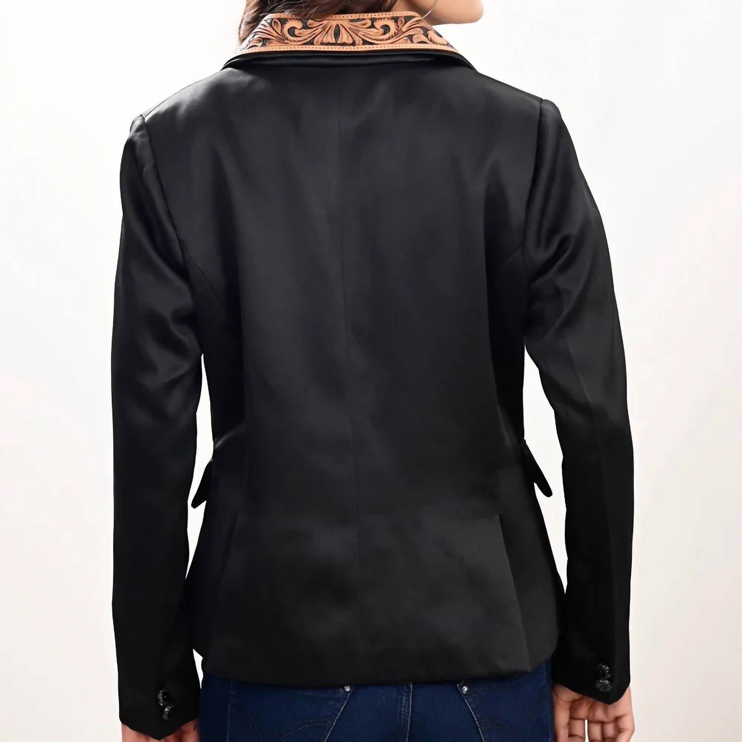 The ultimate cool-girl utility jacket. Elevate your wardrobe with the Leather Lapel Blazer by American Darling, a chic and sophisticated choice in navy blue. This women's blazer features a patterned design with a classic collar and long sleeves, perfect for adding style to workwear ensembles. Fully lined with convenient pockets, its tailored design fastens with a button closure. Ideal for spring and special occasions, this blazer combines refined utility with timeless elegance.