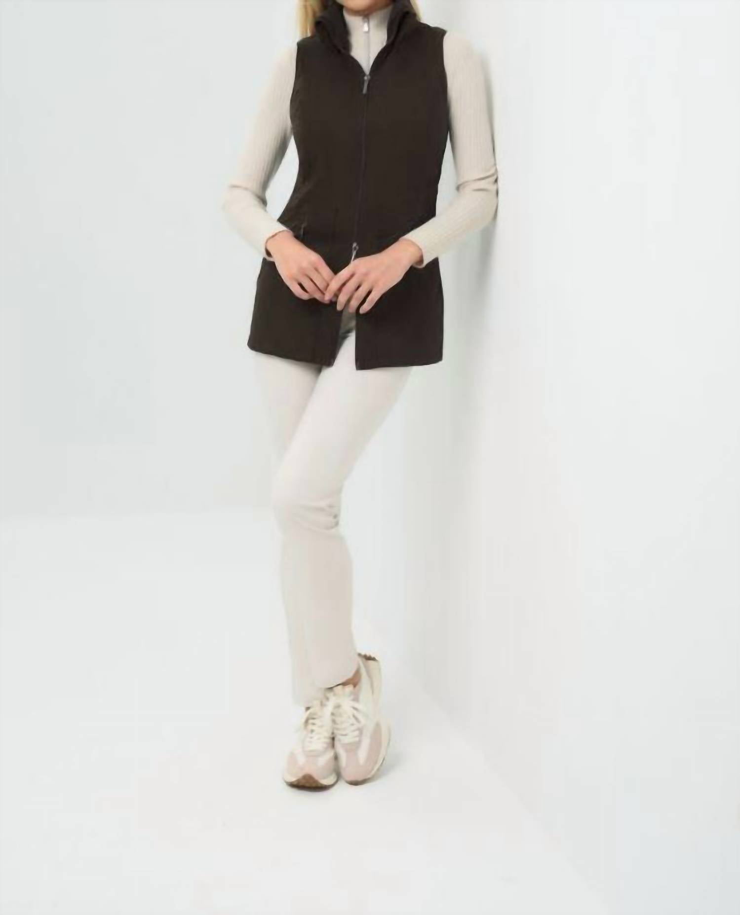 The Anatomie Women's Delaney Mid Weight Stretch Vest in Espresso is a staple for any wardrobe, combining style and functionality. This sleeveless vest, made from 94% Polyamide and 6% Elastane, is designed for a slim fit with a slight flare at the hips, perfect for layering. It features a high fold-over collar with snaps and a practical double zip closure, extending to a low hip length and embellished with antique brass trims. For care, machine wash cold with like colors, tumble dry low, cool iron, or dry clean as preferred, making it suitable for a variety of occasions, especially during spring camping adventures.