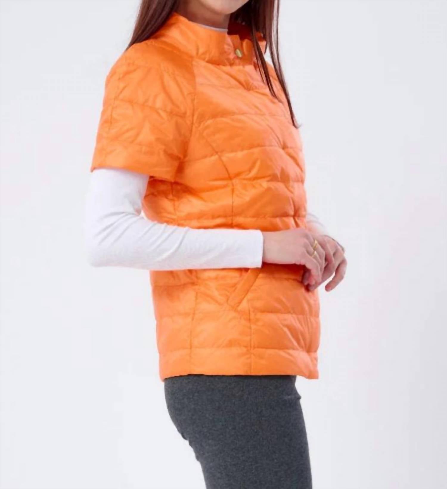 Cozy, cute and timeless. The puffer jacket that will keep you warm all season long. Meet the Zermatt Short Sleeve Quilted Puffer Jacket by ANORAK, a shining example of minimalist winter style in vibrant Solar Orange. This forward-thinking puffer combines short sleeves with a sleek, quilted design, filled with 80% white duck down and 20% feather for optimal warmth without weight. Crafted from 100% nylon, it's designed for ease of movement with a button closure and a collar neckline. Care is a breeze with machine wash and tumble dry instructions, making it perfect for vacation layering.