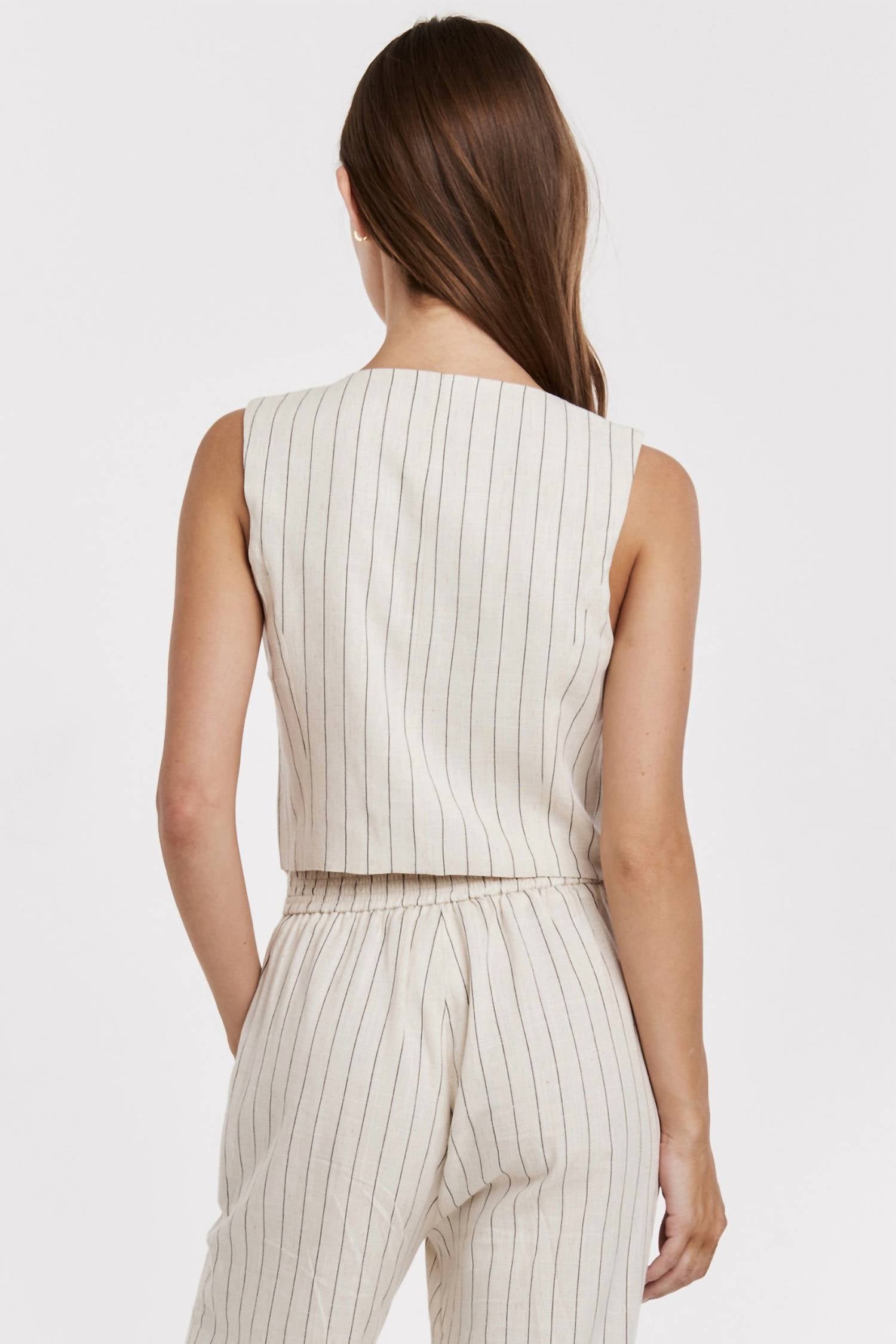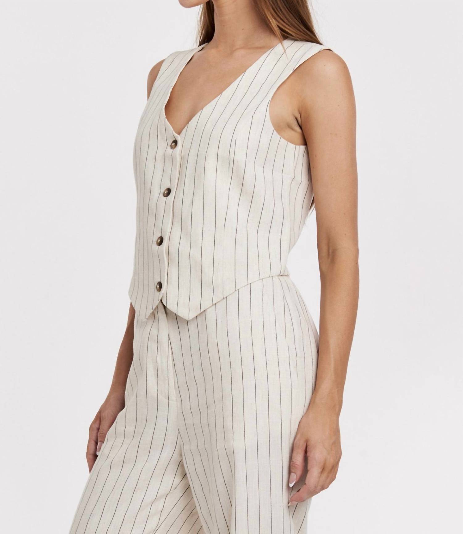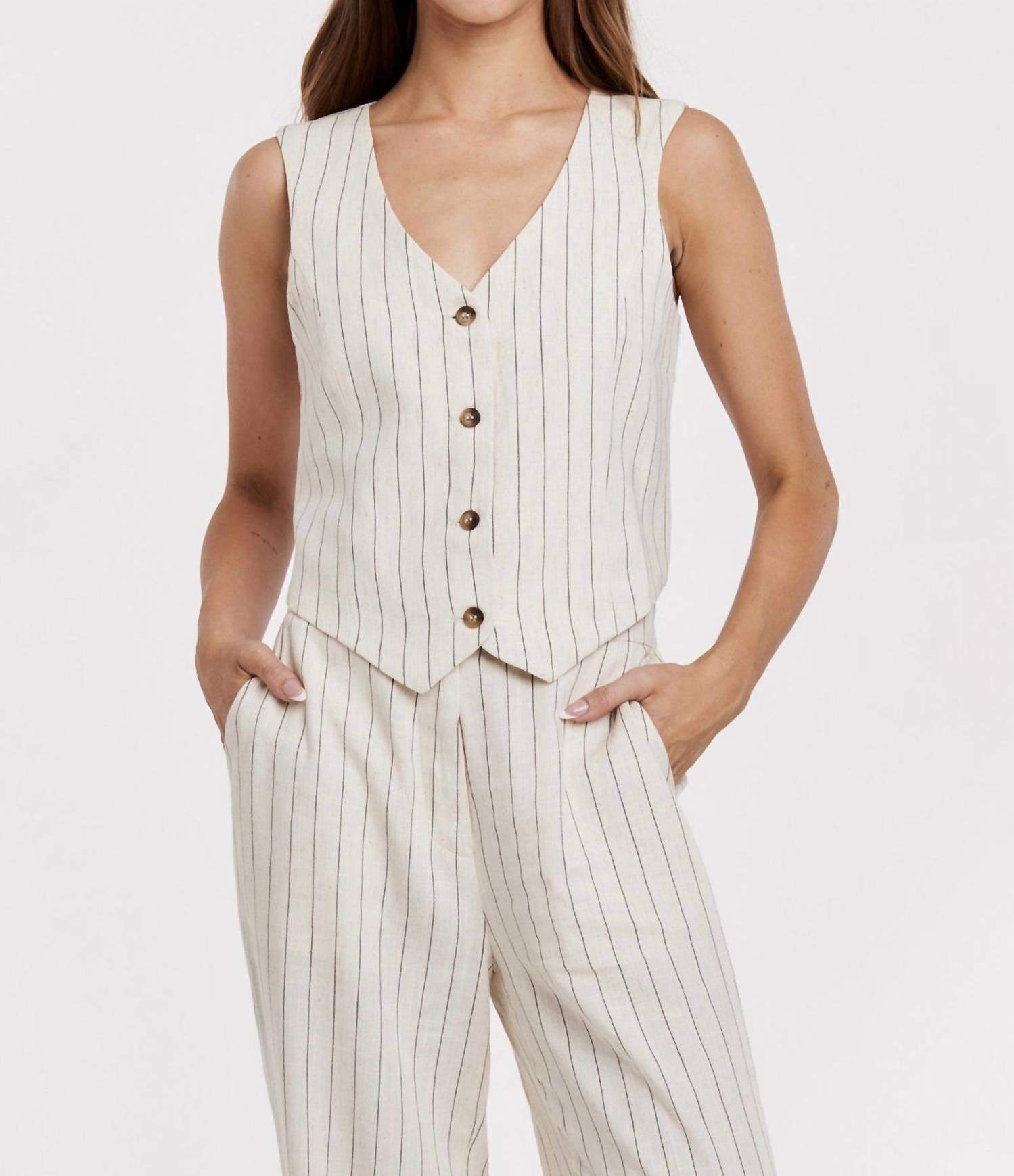 Introducing the Cecilia Novelty Vest by Another Love, a chic addition to any wardrobe. This sleeveless vest features a sophisticated V-neckline and a striking cream and black stripe pattern. Crafted from a linen blend, it offers comfort and style with a flattering tailored fit. Closure: Button closure. Perfect for spring occasions, such as a Thanksgiving holiday party, this minimalist piece ensures versatile styling.