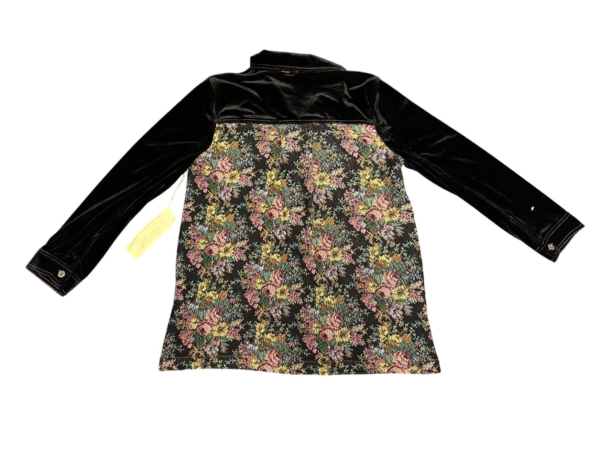 Cute, casual, and comfortable. This jacket is a must have. Discover the Women's Crazy Heart Velvet Jacket by Aratta, an exquisite addition to your casual wardrobe. This black velvet jacket, adorned with a distinctive floral tapestry back panel, offers both style and comfort. The long-sleeve design features a collared neckline, scalloped hem, and two front pockets, complemented by side pockets for added practicality. Composition: 94% Polyester, 6% Spandex. Closure: Button closure. Hand wash with warm water and line dry only.