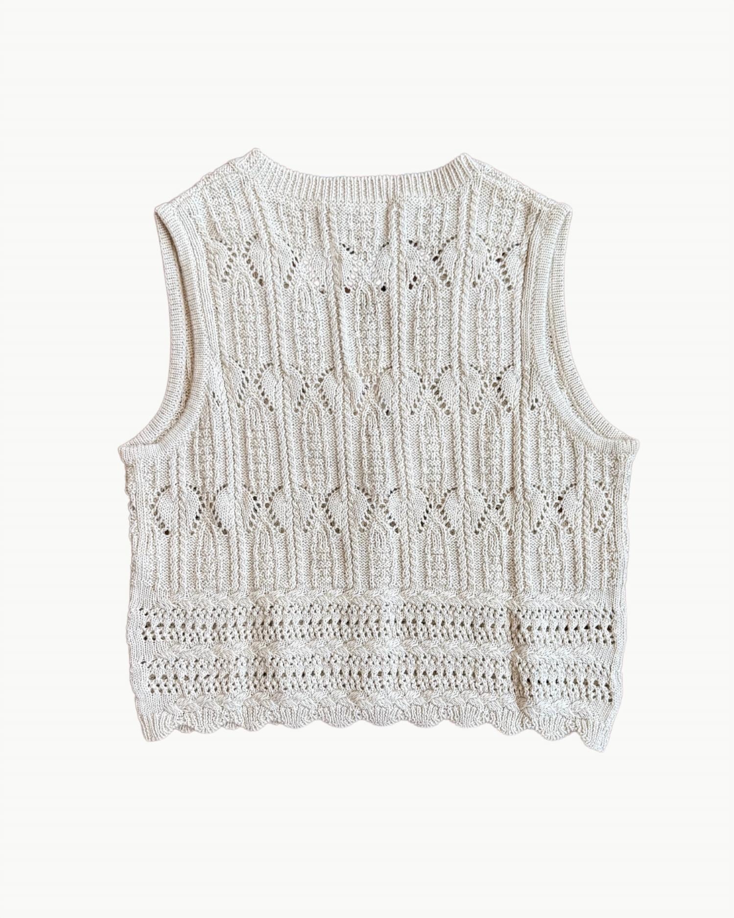 Throw this vest over an all black outfit for a perfectly polished look. Introducing the Mixed Stitch Vest by Autumn Cashmere, a sophisticated essential for warm, sunny days. This sleeveless vest is crafted from breathable cotton, showcasing a textured mixed-stitch design for added visual interest. The piece features a feminine V neckline, with a button-front closure and a charming scalloped hemline, contributing to its romantic appeal. Perfect for travel and spring occasions, the slightly cropped silhouette pairs beautifully with high-rise denim or flowing skirts.
