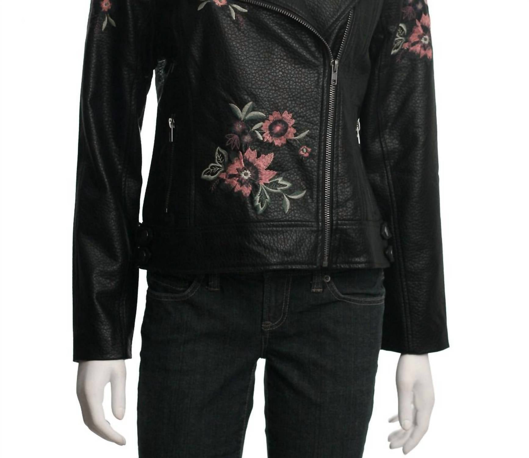 Everyone needs a leather jacket like this in their closet. Introducing the Baxley Embroidered Faux Leather Moto Jacket by BB Dakota, a standout piece that marries edgy style with feminine allure. This women's jacket in black boasts a long sleeve design and intricate floral embroidery on high-quality polyurethane material. It features practical pockets and a zip closure for secure wear. Care for this chic jacket by hand washing to maintain its rebellious yet sophisticated appeal, perfect for fall vacations.