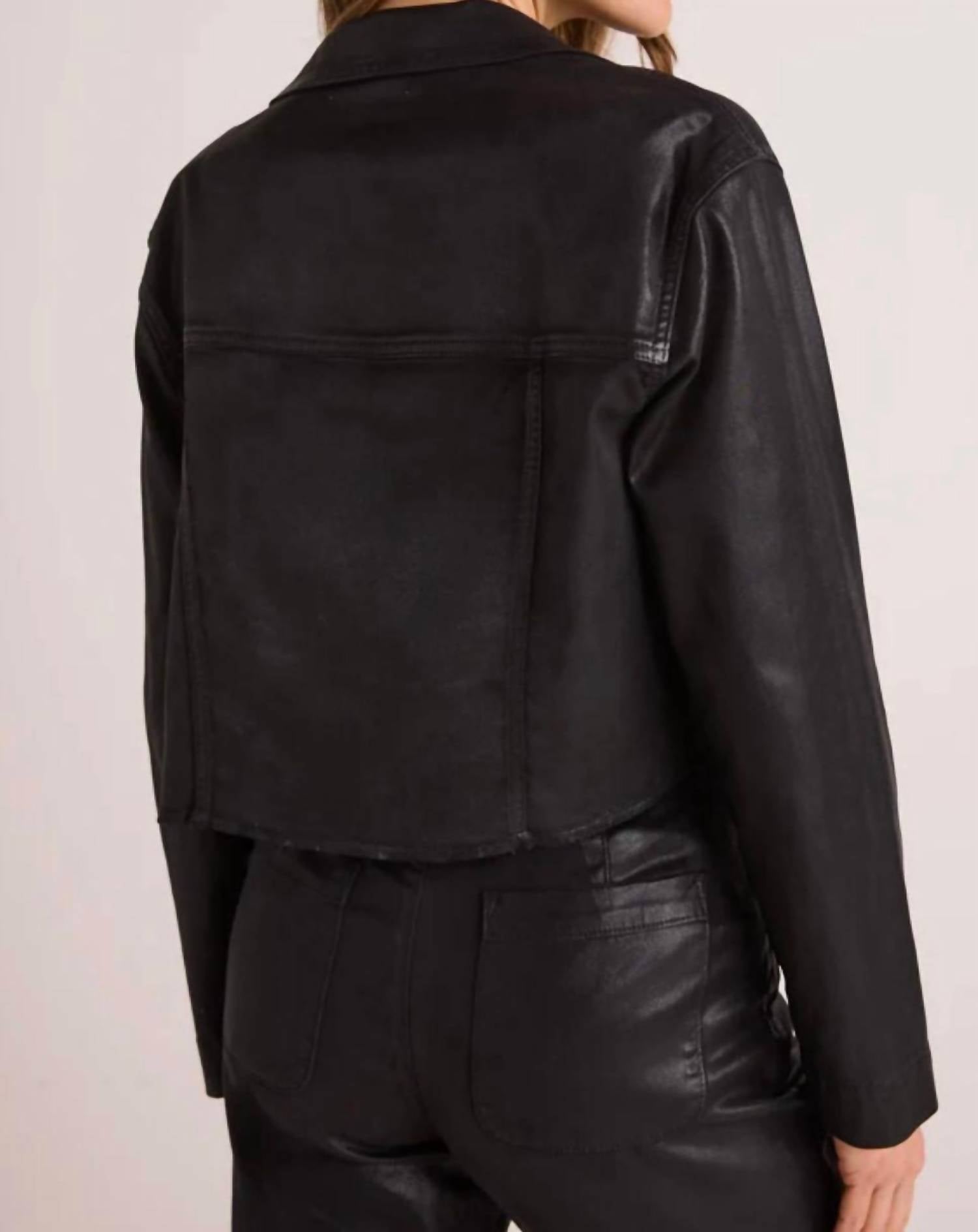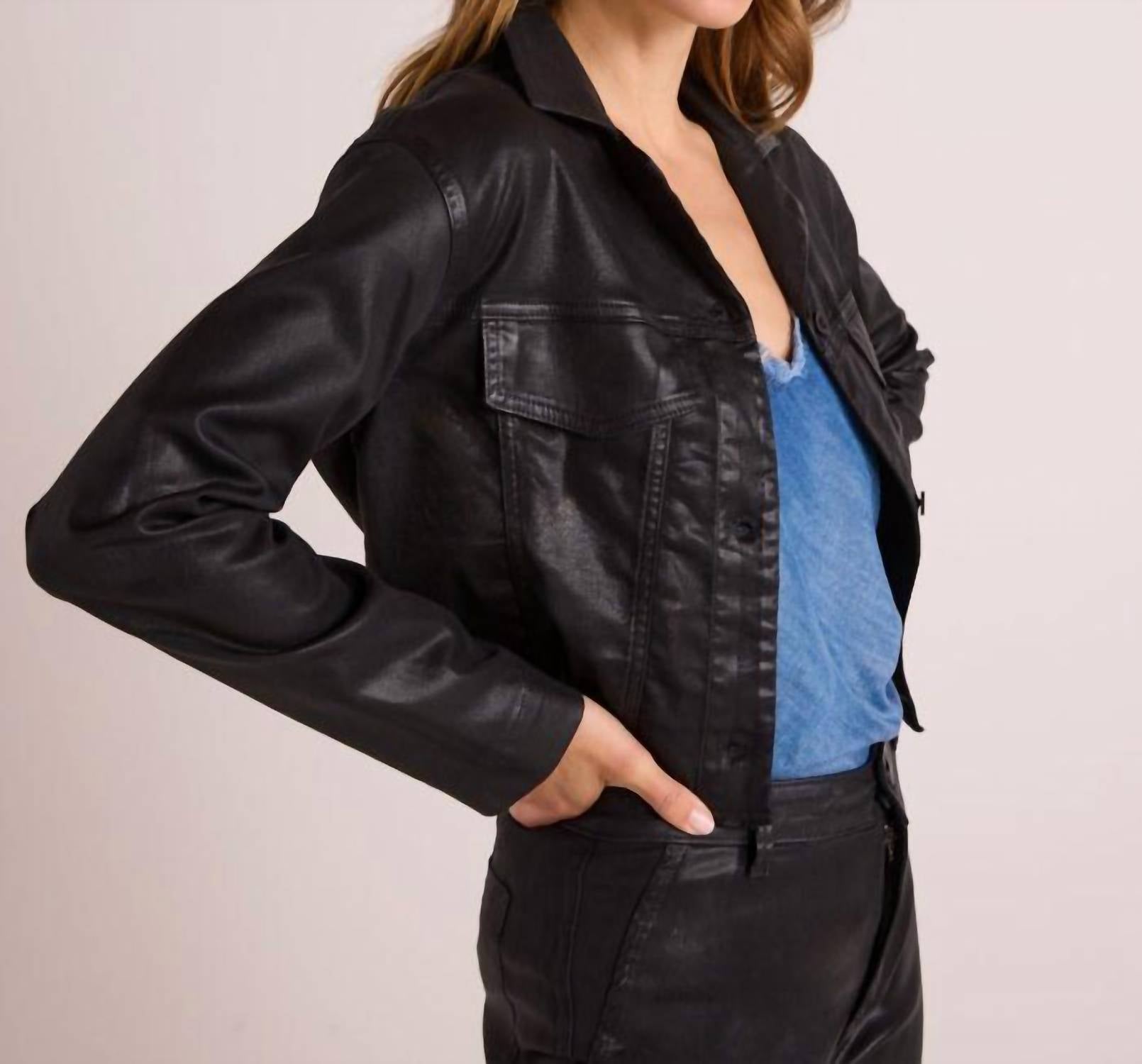 Uma jaqueta de couro tão boa que combina com praticamente qualquer roupa. Conheça a Jaqueta Cropped Billie da Bella Dahl, uma jaqueta de couro essencial para mulheres que exala um visual de couro sintético na cor preta clássica. Este design de manga comprida é confeccionado em uma mistura de 60% TENCEL™ Lyocell, 38% algodão e 2% elastano, apresentando um padrão sólido e bainha desfiada divertida que incorpora uma tendência da moda dos anos 90. Fabricada em Los Angeles, possui fecho de botão e bolsos frontais práticos com aba, perfeitos para adicionar um toque divertido a qualquer look, seja para férias ou para um evento de Ação de Graças. Cuide desta peça com uma rotina de lavagem a seco. A modelo tem 1,78 m e veste tamanho XS.