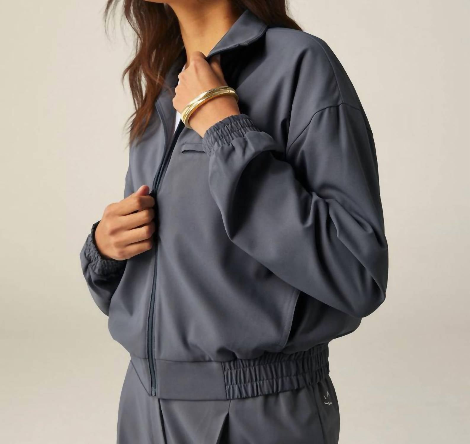A casual yet cool jacket that every closset needs. Step up your travel style with the Status Pocket Sleeve Cropped Jacket by Beyond Yoga, designed for the modern woman in Night Shadow. This minimalist, solid-colored jacket features long sleeves and a chic, cropped length perfect for fall adventures. Crafted from 100% JetStretch Polyester, it boasts a relaxed fit with numerous pockets, including a patch pocket on the right sleeve, a drop-in zip welt pocket at the chest, and convenient side seam pockets. Fully lined with mesh and secured with a zip closure, this versatile piece offers a polished drape, easily maintained with hand wash care.