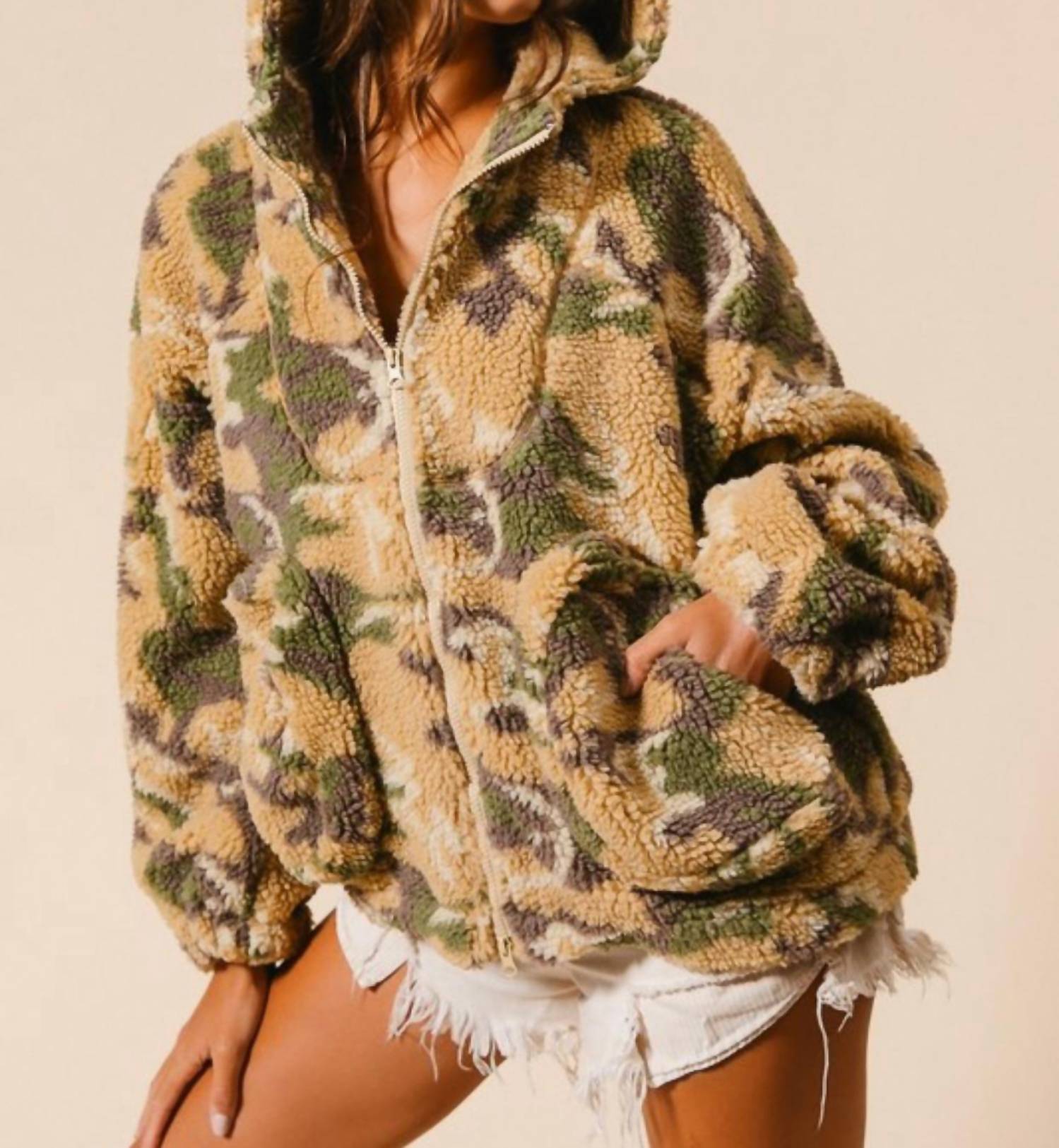 This is a camouflage sherpa fleece jacket with a zipper and hood.