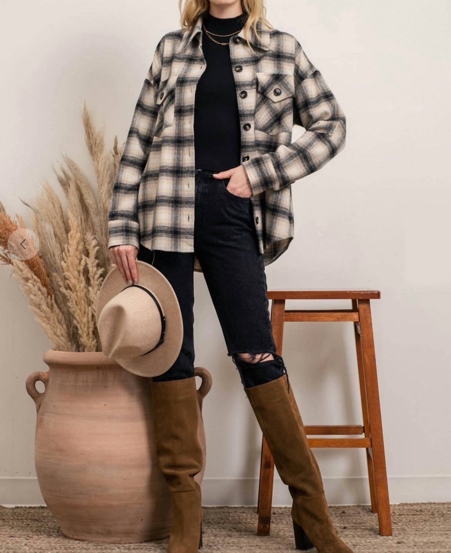 Stay effortlessly stylish with the Blu Pepper Extended Shoulder Plaid Shacket, perfect for transitioning seasons. This women's casual jacket in taupe and black plaid features a chic collared neckline and long sleeves, ensuring both warmth and fashion-forward appeal. Crafted from 100% cotton, it offers two practical pockets and button closure for easy wear. Ideal for any travel occasion and especially fitting for a Western-inspired look during fall.