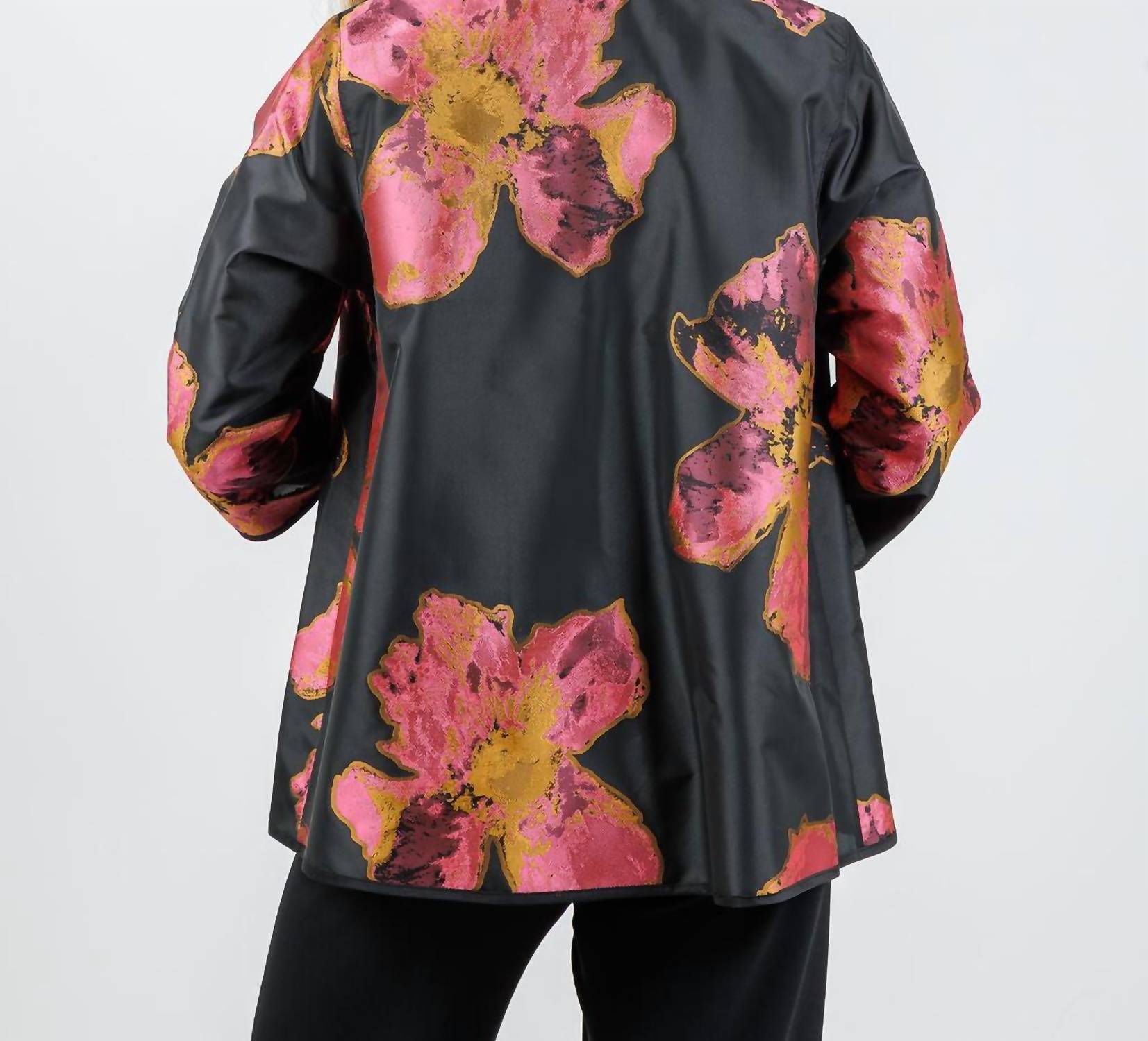 Introducing the Women's Karoima Easy Jacket by CAROLINE ROSE, an elegant blend of bold design and effortless style. This utility jacket features bracelet length sleeves and an open-front style, adorned with a luxurious pink petal print for a striking visual impact. Crafted from 58% Polyester and 42% Viscose, with 100% Silk trim, the jacket is approximately 26 inches in length. Perfect for summer occasions, it offers a relaxed boho chic vibe with a pull-on closure and an easy-care finish. Model Faryn is 5'6", wearing size XS, with a 34" bust, 28.5" waist, and 31" hip.