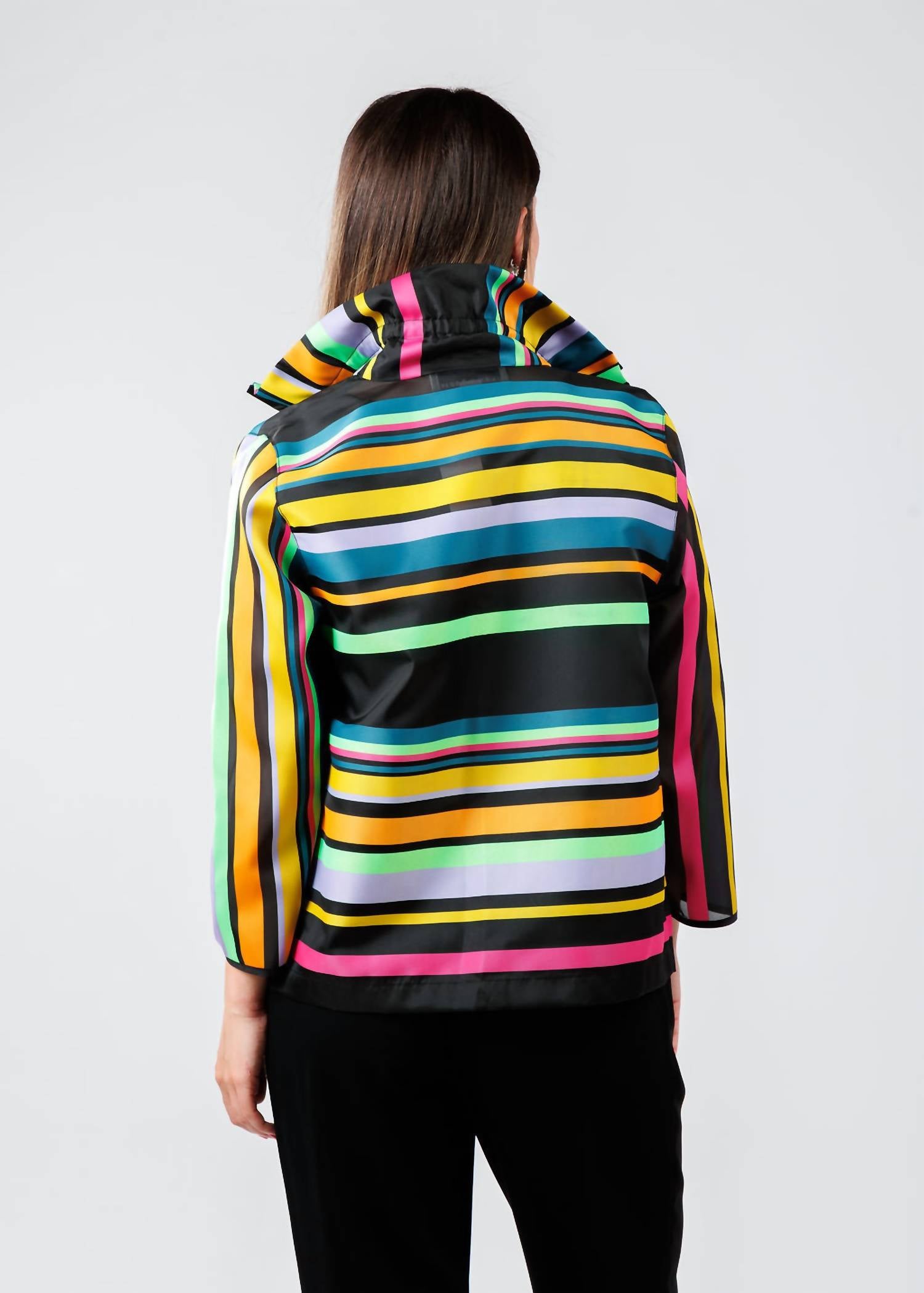 A casual yet cool jacket that every closset needs. Make a statement with the Women's Naomi Ruched Collar Jacket by Caroline Rose, featuring a vibrant multicolor striped pattern on a sleek black base. With long sleeves and crafted from a silky blend of 100% Polyester with 100% Silk trim, this jacket offers a relaxed fit perfect for summer occasions. The open-front style with a distinctive ruched collar adds modern ease to your wardrobe. Closure: Pull-on style.