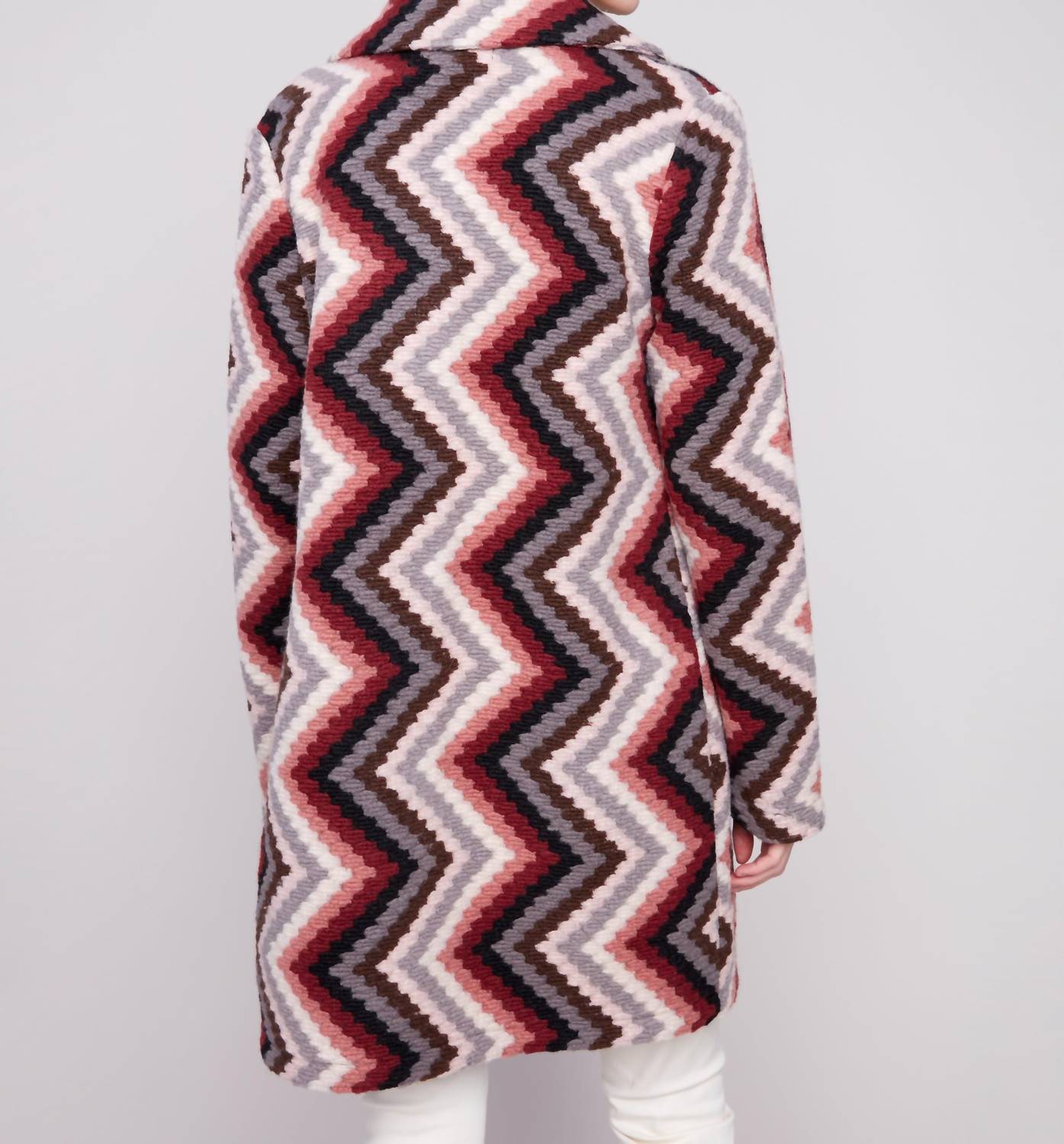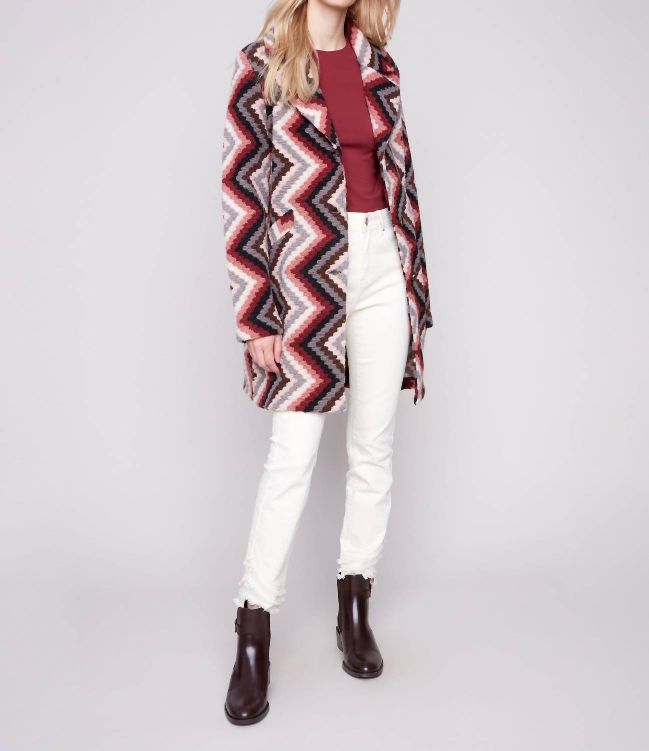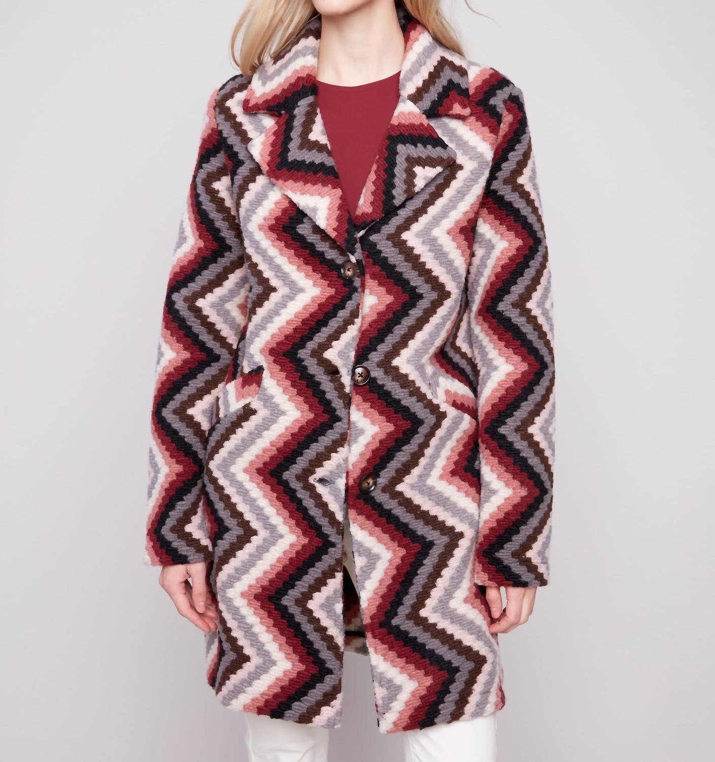 The Long Crochet Coat by Charlie B is a maximalist piece in a vibrant primrose color, perfect for adding flair to your fall wardrobe. Crafted from polyester, this casual jacket features a patterned design with a button closure for elegant style. Its long sleeves and collar neckline make it ideal for vacation and holiday outings, including Christmas festivities. Designed for women, it includes practical pockets and requires dry cleaning for maintenance.