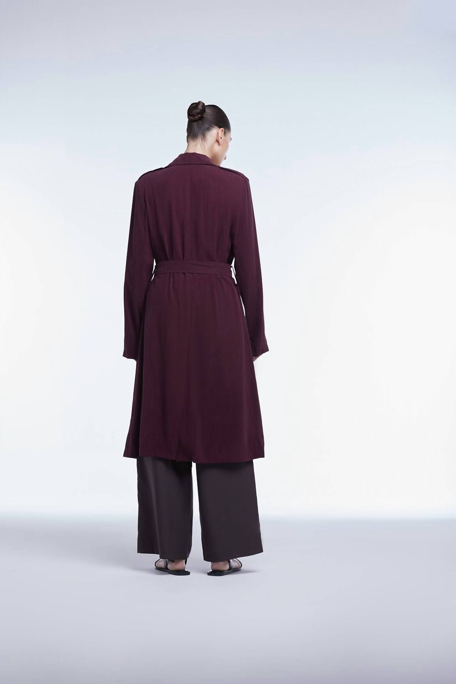 Clássico e chique, este é o tipo de sobretudo que nunca sai de moda. Apresentamos o Trench Coat Flowy Lapel da Dāl the Label em um tom intenso de amora, perfeito para uso em todas as estações. Este casaco de manga comprida apresenta uma silhueta relaxada e solta, com abotoamento duplo na frente e gola pontuda clássica. Com um fecho de gravata elegante e cinto com fivela na cintura, inclui bolsos práticos no quadril e no debrum. Originária da PN, esta peça com estampa sólida requer lavagem a seco e é ideal para um evento noturno de primavera.