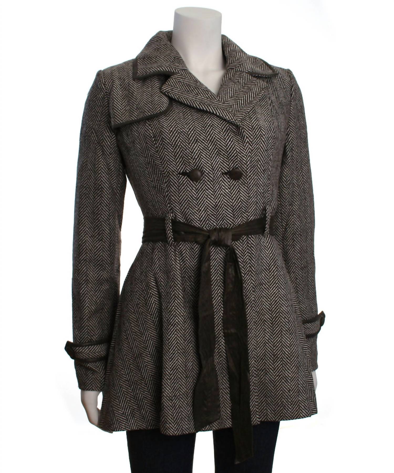 A timeless classic. You'll be reaching for this trench every season. Redefine winter elegance with the Women's Double Breasted A-line Coat by Double Zero. This coffee-hued trench coat showcases a long sleeve design crafted from patterned polyester, complete with a classic notched collar. Its A-line silhouette is enhanced by a button closure and practical pockets, making it a chic and functional choice for engagement occasions or Thanksgiving gatherings. Enhance your workwear with this sophisticated piece, best cared for by a simple hand wash.