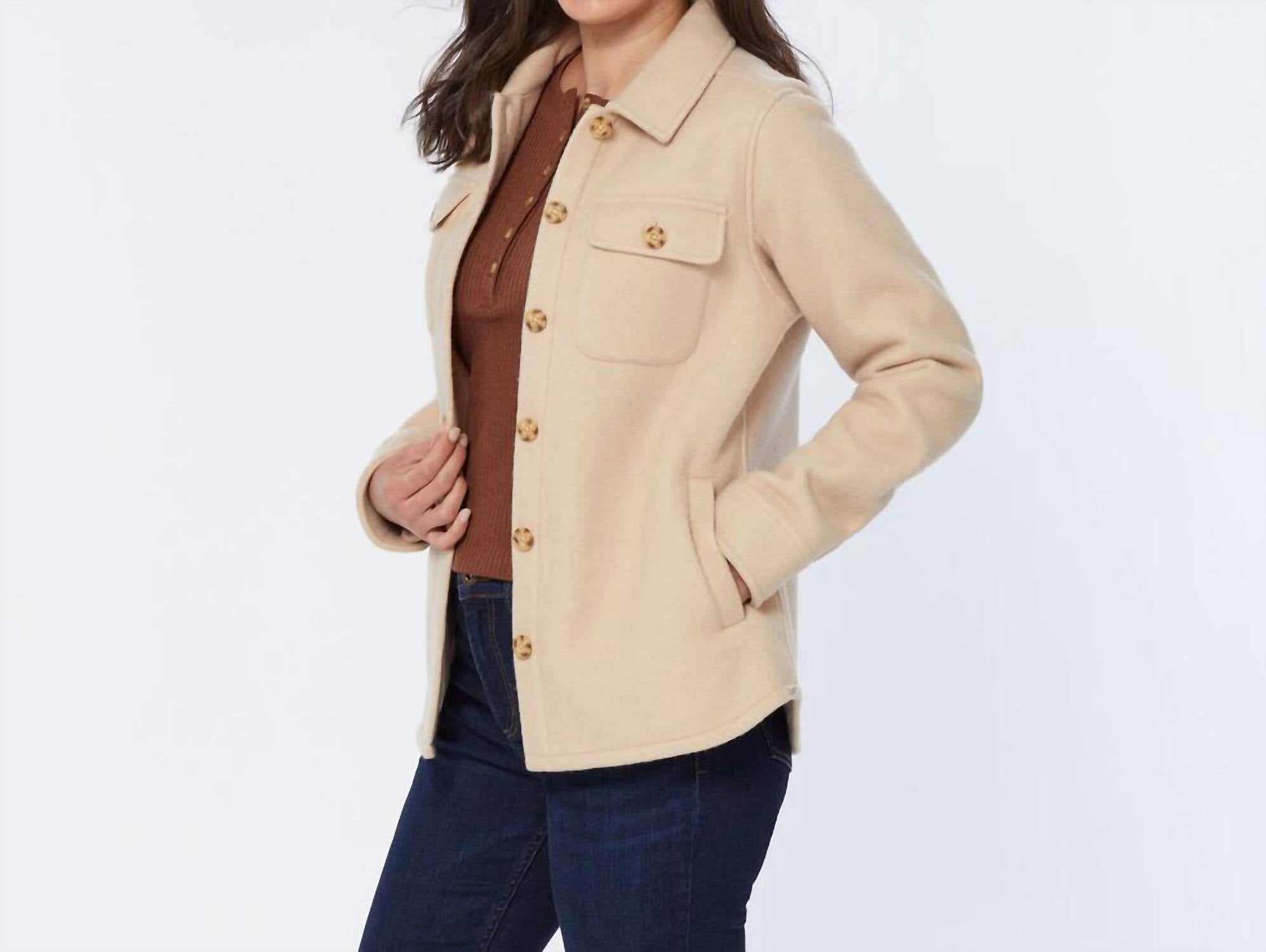 Wrap yourself in the soft comfort of the Timberlodge Fleece Shirt Jacket by Duluth Trading Company, perfect for the fall season. Designed with long sleeves and crafted from a blend of 75% Polyester and 25% Acrylic, this oat-colored "shacket" offers durability and warmth. It features a classic collar and a convenient button-front closure, along with four practical pockets—two on the chest and two at the waist—for added functionality. Easy to care for, simply machine wash as needed for continued wear.