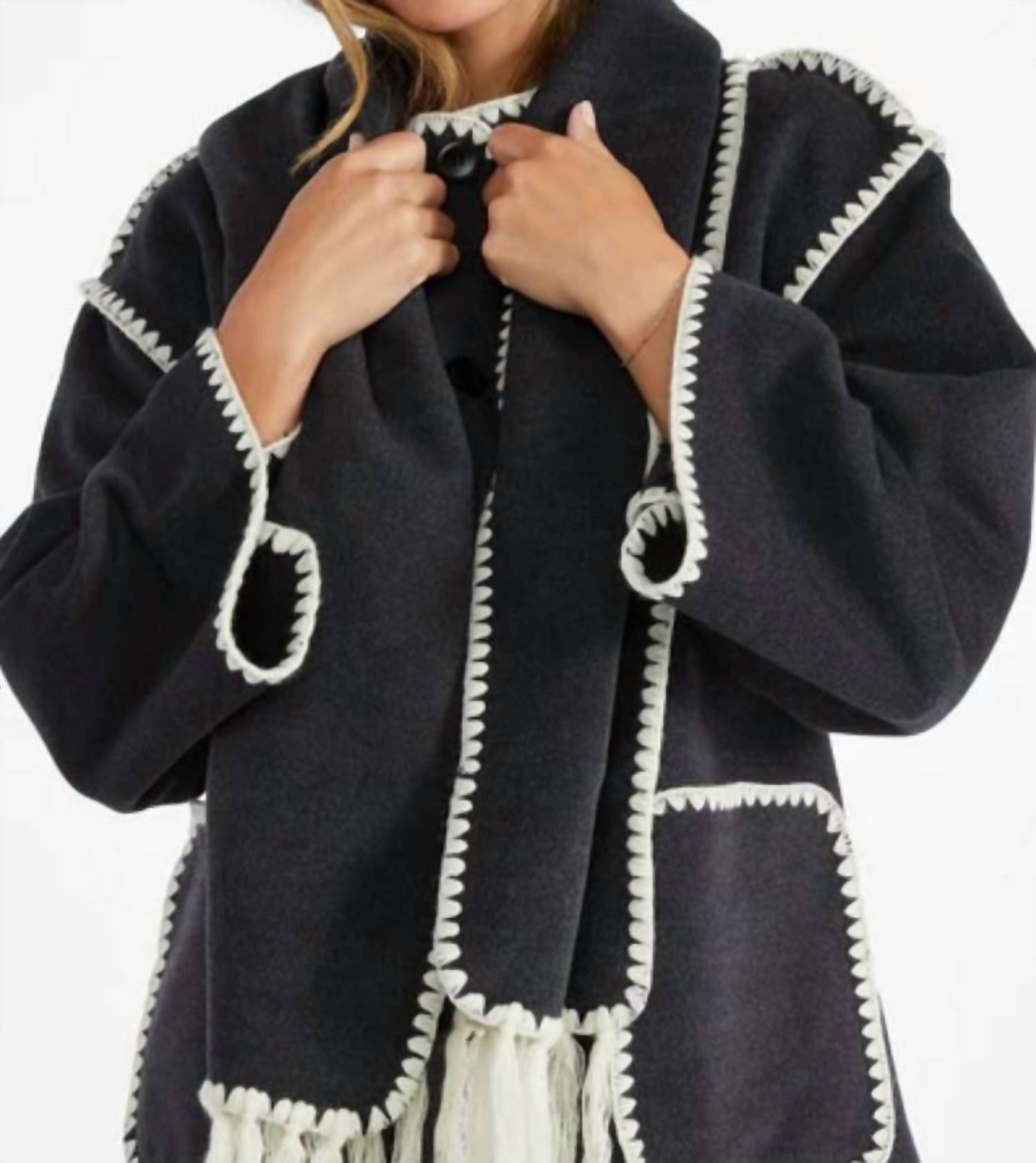 A casual yet cool jacket that every closset needs. Introducing the Whip Stitch Scarf Coat by ELAN, a must-have for every wardrobe this fall. This casual jacket, rendered in solid black, features long sleeves and a classic collar that complements its minimalist style. Crafted from a durable polyester blend, it includes practical pockets for added convenience, perfectly balancing elegance and functionality. Closure is achieved with chic button closures, while its design is ideal for travel and Thanksgiving gatherings.