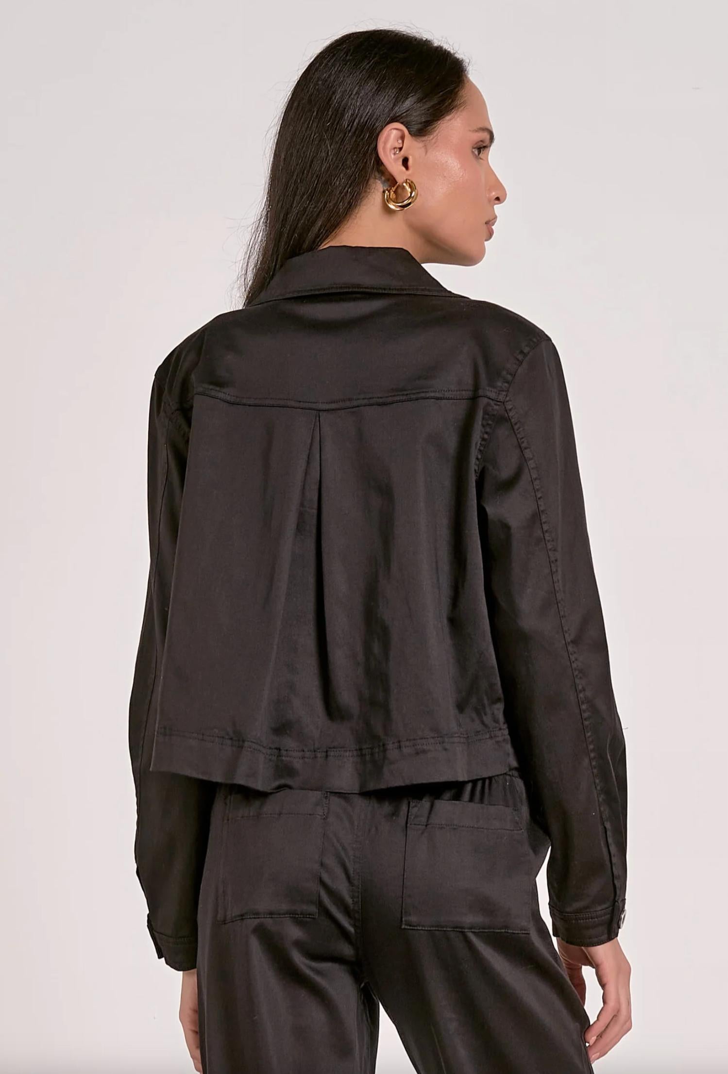 Discover the Women's Iris Cropped Jacket by ELAN, a striking monochrome piece perfect for vacation vibes this spring. This casual jacket features long sleeves and a traditional collar in solid black, crafted from lightweight Tencel fabric for breathable comfort. The versatile design, complete with a button closure, doubles as a top and is cropped to create a flattering silhouette. Care instructions are not available; the model is wearing a size small and stands at 5'9" with measurements of 34" bust, 25" waist, and 36.5" hips.