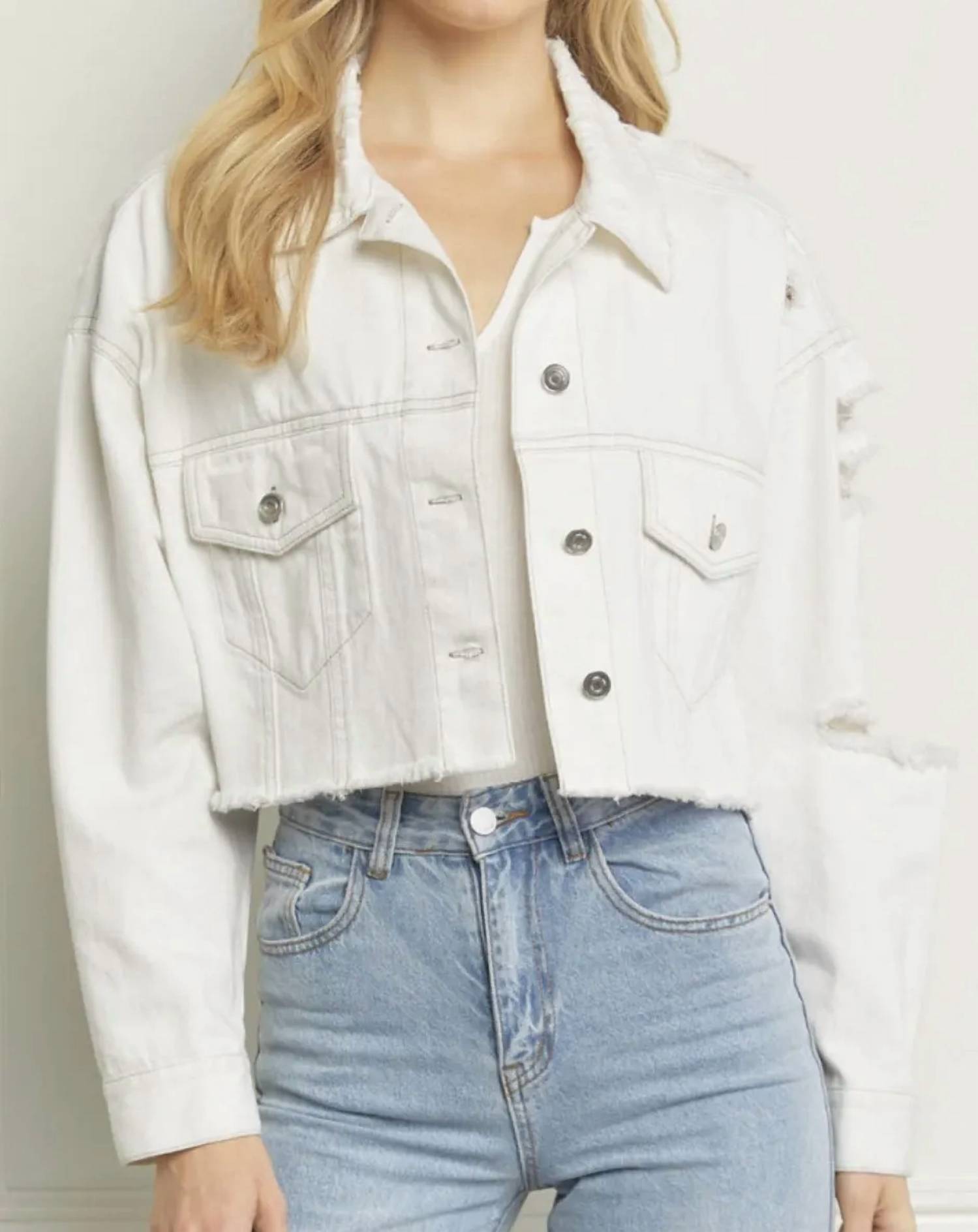 The perfect jean jacket for those slightly crisper days between seasons. Embrace vintage charm with the Cropped Denim Jacket by Entro in a chic cream hue, perfect for a spring concert. This solid-patterned jean jacket is crafted from durable denim and features long sleeves, a classic collar, and front pockets for added functionality. The frayed hem adds a touch of distressed style, while the button closure ensures a secure fit. Care instructions: Machine wash. Ideal for women who love timeless fashion.