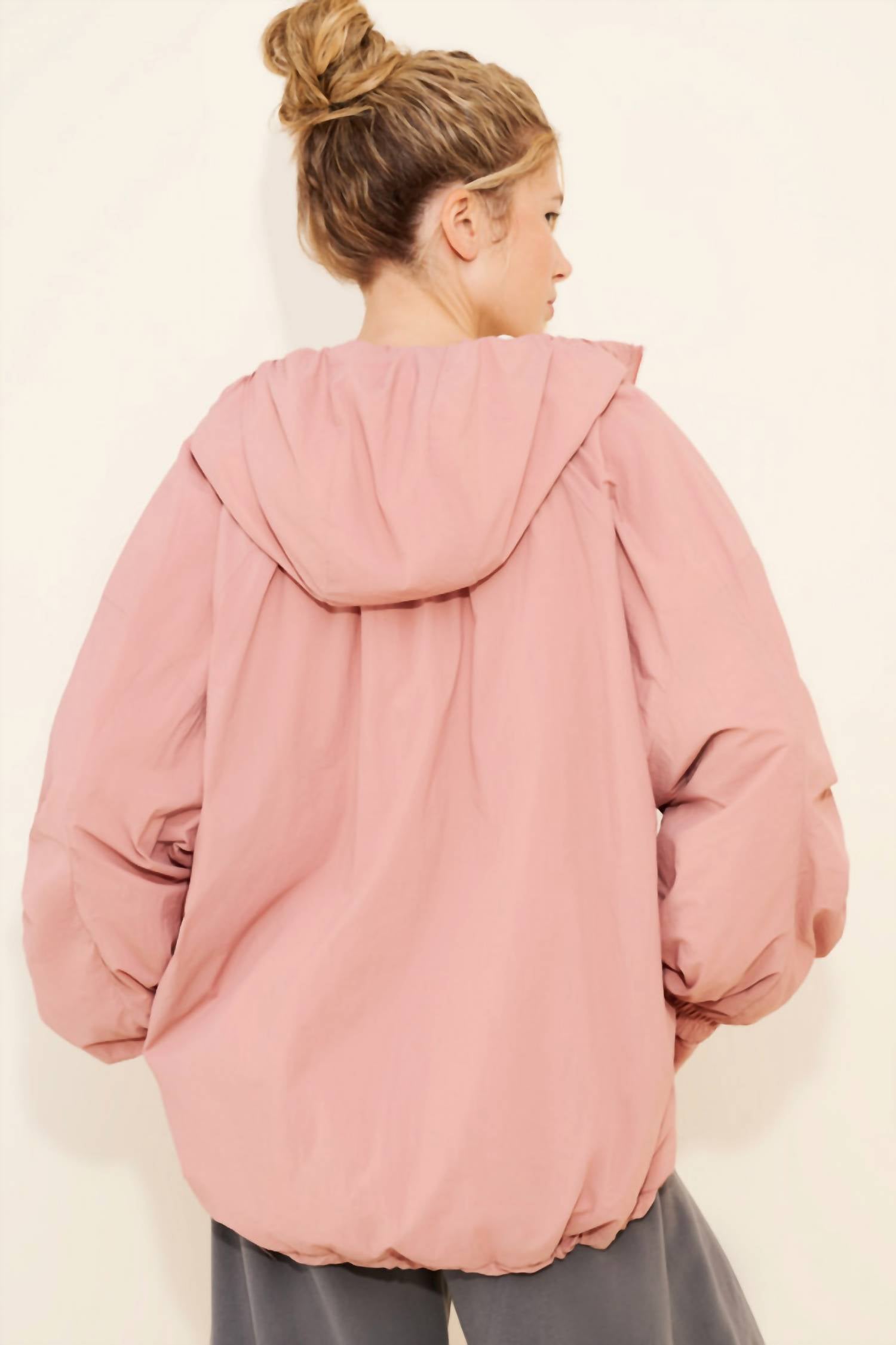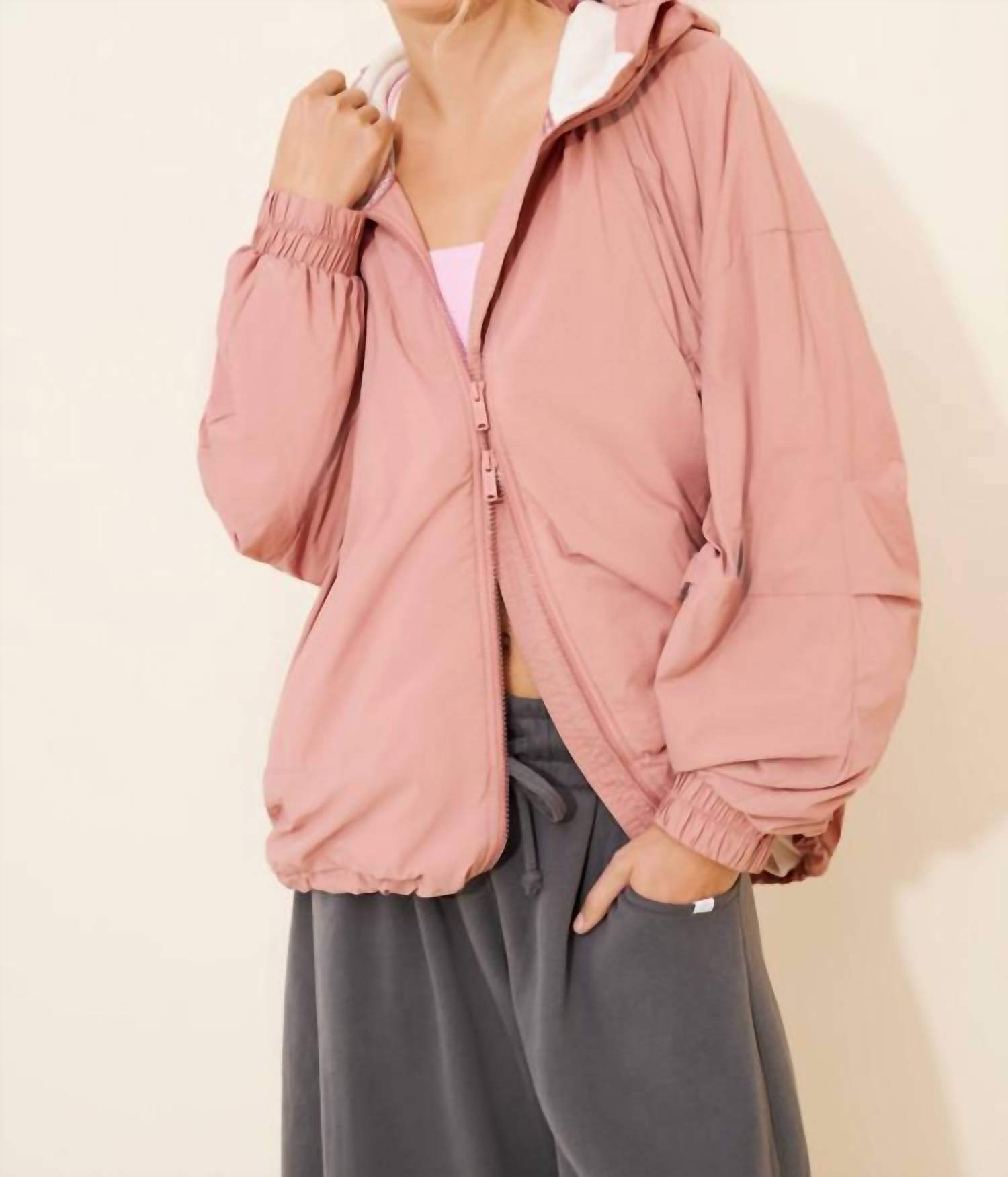 A riff on your favorite classic bomber jacket. Discover the Explore More Fleece Jacket by Free People, the ultimate addition to your outdoor wardrobe in a sweet Petal Pink hue. With long sleeves and a slouchy fit, this bomber jacket is expertly crafted from 100% nylon, featuring a warm, fleece-lined interior made from 100% polyester. Designed with a hood and a convenient zip closure, its 26.5-inch length offers coverage and comfort. Enjoy the practicality of zipper hand pockets and easy care with machine washability.
