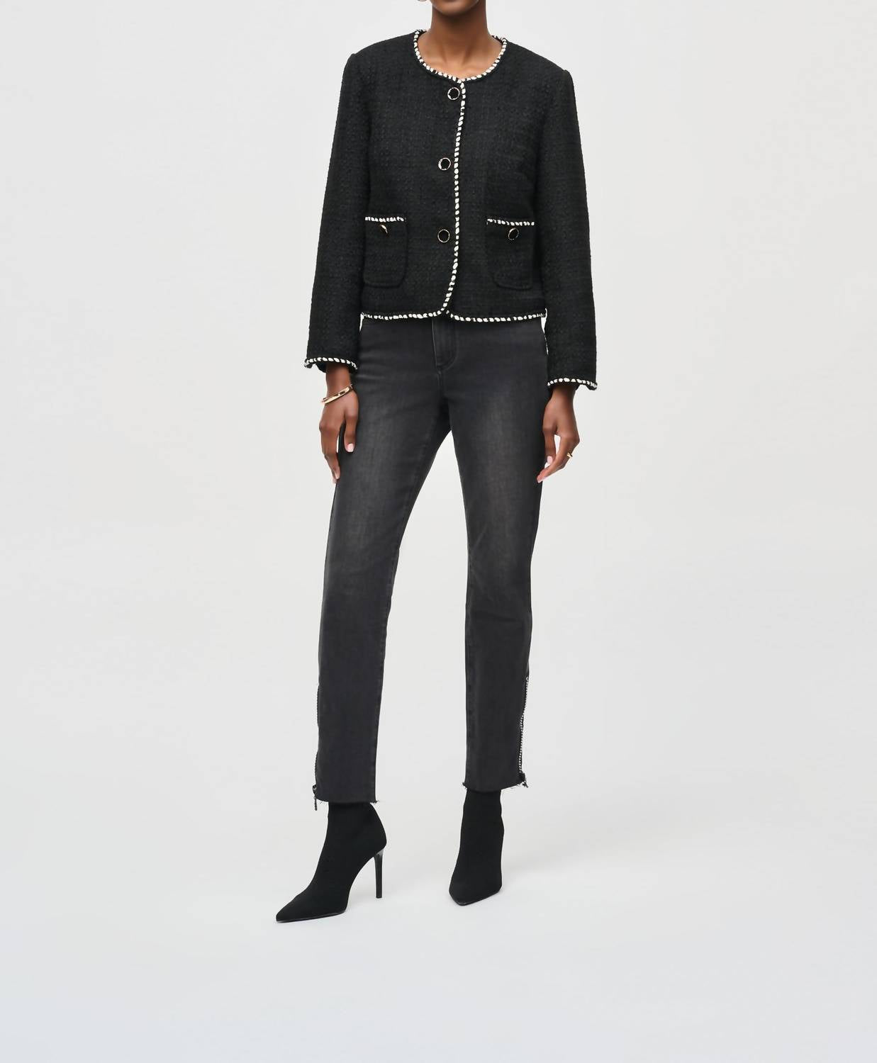 Eleve seu guarda-roupa com a Jaqueta Joseph Ribkoff Bouclé Contrast na cor preta, uma obra-prima texturizada projetada para sofisticação moderna. Confeccionada com mangas longas, a jaqueta possui composição 95% poliéster e 5% lã, com um comprimento prático de 59 cm. Originária do Canadá, esta peça estilosa possui fecho de botão e bolsos falsos para um toque especial. Para manter seu estado impecável, lembre-se de lavá-la à mão e secá-la na horizontal.