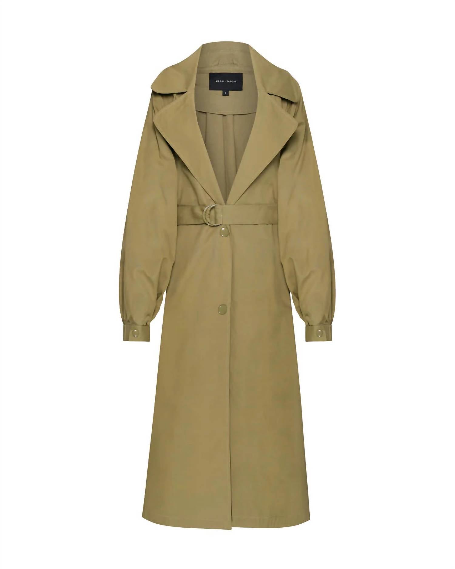 The perfect trench coat that you can throw over any outfit. Discover the Noelle Parka by Magali Pascal, an oversized statement piece in olive with a cape-inspired silhouette. Featuring practical design elements such as front and hidden side pockets, this long-sleeve parka is crafted from a cotton blend and has a button closure for added style. It's perfect for transitional weather with its fine cotton canvas material; simply pair with Noelle Pants for a complete look. Care for this stunning piece with a cold gentle machine wash, hot iron, and avoid tumble drying for best results. Model is 5'10" and wearing a size small.